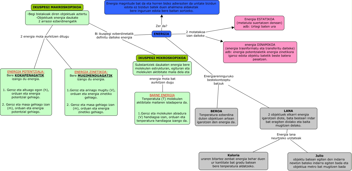 Este Cmap, tiene información relacionada con: hezkuntza_111, LANA 2 objektuek elkarri energia igarotzen diote, bata besteari indar bat eragiten diolako eta baita mugitzen delako. Energia lana neurtzeko unitateak Kaloria uraren bitartez zenbat energia behar duen ur kantitate bat gradu batean bere tenperatura aldatzeko., ENERGIA Energiareninguruko bestekontzeptu batzuk BEROA Tenperatura ezberdina duten objektuen artean igarotzen den energia da., Substantziek daukaten energia bere molekulen estrukturan, egituran eta molekulen aktibitate maila dela eta energia mota bat aurkitzen dugu BARNE ENERGIA Tenperatuta (T) molekulen aktibitate mailaren isladapena da. 1.Geroz eta molekulen abiadura (V) handiagoa izan, orduan eta tenperatura handiagoa izango da., ENERGIA Energiareninguruko bestekontzeptu batzuk LANA 2 objektuek elkarri energia igarotzen diote, bata besteari indar bat eragiten diolako eta baita mugitzen delako., -Begi bistakoak diren objektuak aztertu -Objektuek energia daukate 2 arrazoi ezberdinengatik 2 energia mota aurkitzen ditugu ENERGIA POTENTZIALA: Bere KOKAPENAGATIK izango du energia. 1. Geroz eta altuago egon (h), orduan eta energia potentzial gehiago. 2. Geroz eta masa gehiago izan (m), orduan eta energia potentzial gehiago., ENERGIA Zer da? Energia magnitude bat da eta horren bidez adierazten da unitate bizidun edota ez bizidun batek duen ahalmena aldaketak bere inguruan edota bere baitan sortzeko., LANA 2 objektuek elkarri energia igarotzen diote, bata besteari indar bat eragiten diolako eta baita mugitzen delako. Energia lana neurtzeko unitateak Julio objektu batean egiten den indarra newton bateko indarra egiten bada eta objektua metro bat mugitzen bada, ENERGIA 2 motatakoa izan daiteke energia DINAMIKOA (energia trasnformatu eta transferitu daiteke) adb: energia potentzialetik energia zinetikora igaroz edota objektu batetik beste batera pasatzen., ENERGIA Bi ikuspegi ezberdinetatik definitu daiteke energia IKUSPEGI MIKROSKOPIKOA, IKUSPEGI MAKROSKOPIKOA -Begi bistakoak diren objektuak aztertu -Objektuek energia daukate 2 arrazoi ezberdinengatik, -Begi bistakoak diren objektuak aztertu -Objektuek energia daukate 2 arrazoi ezberdinengatik 2 energia mota aurkitzen ditugu ENERGIA ZINETIKOA: Bere MUGIMENDUAGATIK izango du energia. 1.Geroz eta arinago mugitu (V), orduan eta energia zinetiko gehiago. 2. Geroz eta masa gehiago izan (m), orduan eta energia zinetiko gehiago., ENERGIA 2 motatakoa izan daiteke Energia ESTATIKOA (metatuta suertatzen denean) adb: Urtegi baten ura, ENERGIA Bi ikuspegi ezberdinetatik definitu daiteke energia IKUSPEGI MAKROSKOPIKOA