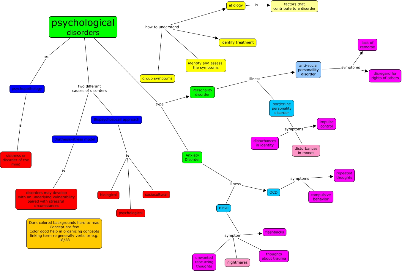 This Concept Map, created with IHMC CmapTools, has information related to: ch 13 zach corzine 18, OCD symptoms compulsive behavior, Biopsychosocail approach is biological, anti-social personaility disorder symptoms lack of remorse, anti-social personaility disorder symptoms disregard for rights of others, Anxiety Disorder illness OCD, psychological disorders how to understand identify treatment, psychological disorders two differant causes of disorders Diathesis-stress model, psychological disorders how to understand group symptoms, psychological disorders type Anxiety Disorder, psychological disorders type Personality disorder, psychological disorders two differant causes of disorders Biopsychosocail approach, Diathesis-stress model is disorders may develop with an underlying vulnerability paired with stressful circumstances, PTSD symptom unwanted reocurring thoughts, OCD symptoms repeated thoughts, Personality disorder illness borderline personality disorder, PTSD symptom thoughts about trauma, borderline personality disorder symptoms impulse control, Anxiety Disorder illness PTSD, PTSD symptom flashbacks, etiology is factors that contribute to a disorder