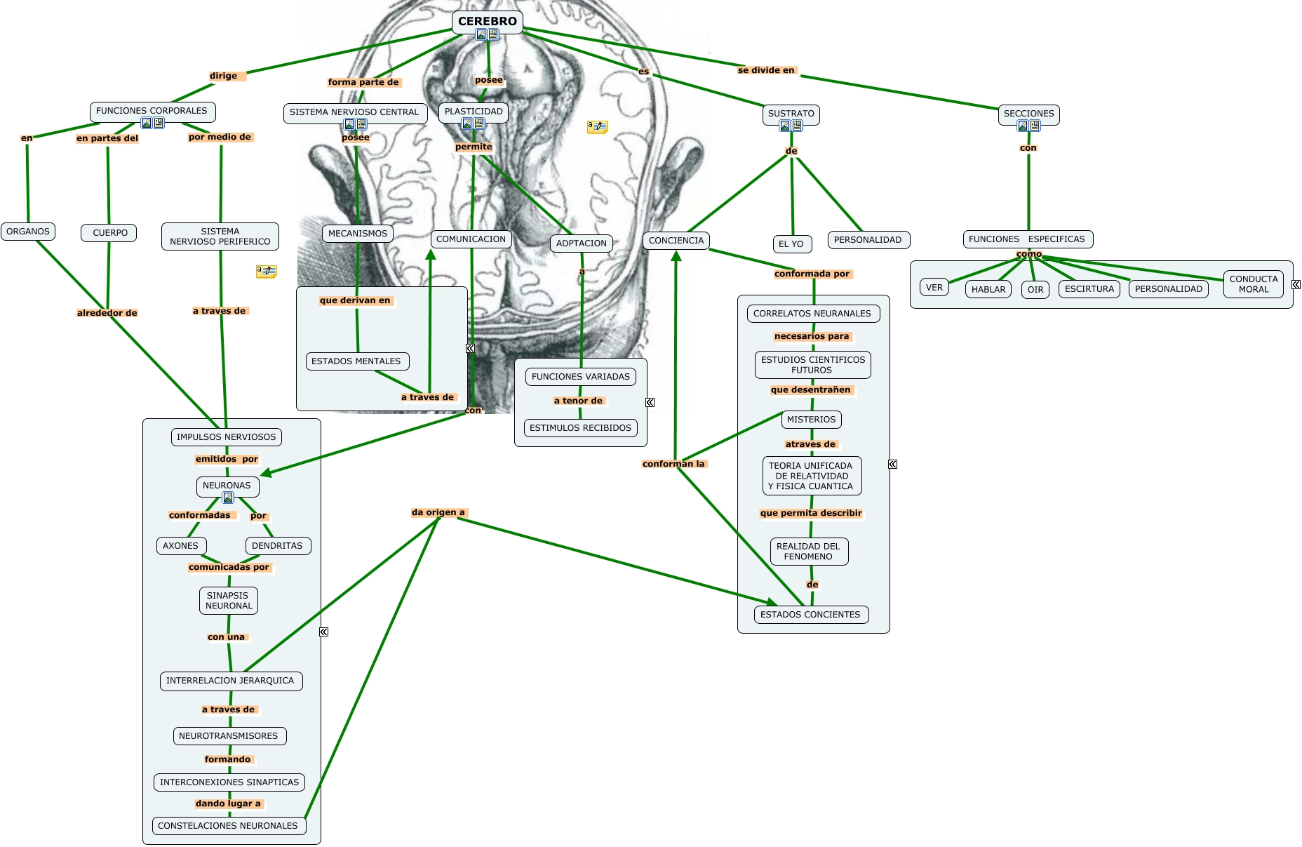 Este Cmap, tiene información relacionada con: Como funciona el Cerebro, CEREBRO es SUSTRATO, FUNCIONES ESPECIFICAS como CONDUCTA MORAL, CEREBRO dirige FUNCIONES CORPORALES, FUNCIONES ESPECIFICAS como OIR, INTERRELACION JERARQUICA da origen a CONSTELACIONES NEURONALES, ESTADOS CONCIENTES conforman la CONCIENCIA, ESTUDIOS CIENTIFICOS FUTUROS que desentrañen MISTERIOS, ESTADOS MENTALES a traves de COMUNICACION, PLASTICIDAD permite COMUNICACION, FUNCIONES CORPORALES en partes del CUERPO, CEREBRO posee PLASTICIDAD, CONCIENCIA conformada por CORRELATOS NEURANALES, FUNCIONES ESPECIFICAS como PERSONALIDAD, ESTADOS CONCIENTES conforman la MISTERIOS, SECCIONES con FUNCIONES ESPECIFICAS, ADPTACION a FUNCIONES VARIADAS, SUSTRATO de EL YO, FUNCIONES CORPORALES en ORGANOS, NEUROTRANSMISORES formando INTERCONEXIONES SINAPTICAS, INTERRELACION JERARQUICA a traves de NEUROTRANSMISORES