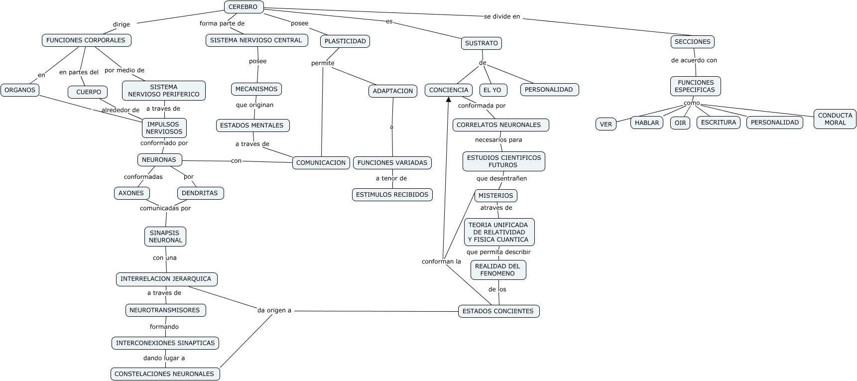 Este Cmap, tiene información relacionada con: Como funciona el Cerebro 2, FUNCIONES ESPECIFICAS como CONDUCTA MORAL, CEREBRO dirige FUNCIONES CORPORALES, FUNCIONES ESPECIFICAS como OIR, CEREBRO se divide en SECCIONES, SUSTRATO de EL YO, INTERRELACION JERARQUICA da origen a CONSTELACIONES NEURONALES, ESTADOS CONCIENTES conforman la CONCIENCIA, ESTUDIOS CIENTIFICOS FUTUROS que desentrañen MISTERIOS, PLASTICIDAD permite COMUNICACION, FUNCIONES CORPORALES en partes del CUERPO, CONCIENCIA conformada por CORRELATOS NEURONALES, COMUNICACION con NEURONAS, FUNCIONES ESPECIFICAS como PERSONALIDAD, ESTADOS CONCIENTES conforman la MISTERIOS, SECCIONES de acuerdo con FUNCIONES ESPECIFICAS, ADAPTACION a FUNCIONES VARIADAS, ESTADOS MENTALES a traves de COMUNICACION, FUNCIONES CORPORALES en ORGANOS, IMPULSOS NERVIOSOS ORGANOS, CEREBRO posee PLASTICIDAD