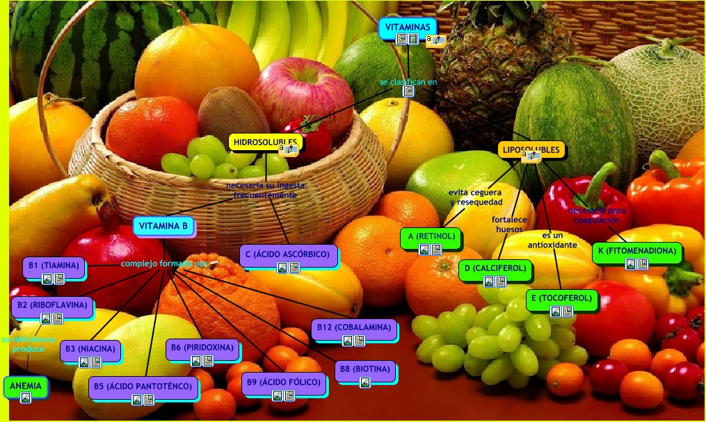 This Concept Map, created with IHMC CmapTools, has information related to: Vitaminas AA, LIPOSOLUBLES es un antioxidante E (TOCOFEROL), HIDROSOLUBLES necesaria su ingesta frecuentemente C (ÁCIDO ASCÓRBICO), LIPOSOLUBLES evita ceguera y resequedad A (RETINOL), VITAMINA B complejo formado por B12 (COBALAMINA), VITAMINA B complejo formado por B5 (ÁCIDO PANTOTÉNCO), VITAMINAS se clasifican en LIPOSOLUBLES, VITAMINA B complejo formado por B8 (BIOTINA), VITAMINA B complejo formado por B1 (TIAMINA), HIDROSOLUBLES necesaria su ingesta frecuentemente VITAMINA B, LIPOSOLUBLES fortalece huesos D (CALCIFEROL), VITAMINAS se clasifican en HIDROSOLUBLES, VITAMINA B complejo formado por B3 (NIACINA), B2 (RIBOFLAVINA) su deficiencia produce ANEMIA, VITAMINA B complejo formado por B2 (RIBOFLAVINA), VITAMINA B complejo formado por B6 (PIRIDOXINA), LIPOSOLUBLES necesaria para coagulación K (FITOMENADIONA), VITAMINA B complejo formado por B9 (ÁCIDO FÓLICO)