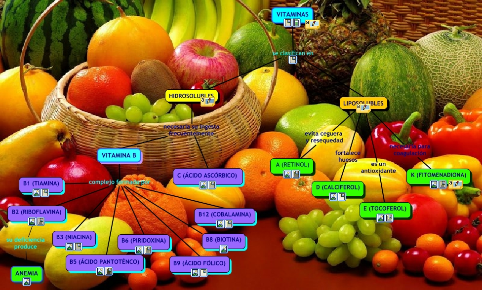 This Concept Map, created with IHMC CmapTools, has information related to: Vitaminas b, LIPOSOLUBLES es un antioxidante E (TOCOFEROL), HIDROSOLUBLES necesaria su ingesta frecuentemente C (ÁCIDO ASCÓRBICO), LIPOSOLUBLES evita ceguera y resequedad A (RETINOL), VITAMINA B complejo formado por B12 (COBALAMINA), VITAMINA B complejo formado por B5 (ÁCIDO PANTOTÉNCO), VITAMINAS se clasifican en LIPOSOLUBLES, VITAMINA B complejo formado por B8 (BIOTINA), VITAMINA B complejo formado por B1 (TIAMINA), HIDROSOLUBLES necesaria su ingesta frecuentemente VITAMINA B, LIPOSOLUBLES fortalece huesos D (CALCIFEROL), VITAMINAS se clasifican en HIDROSOLUBLES, VITAMINA B complejo formado por B3 (NIACINA), B2 (RIBOFLAVINA) su deficiencia produce ANEMIA, VITAMINA B complejo formado por B2 (RIBOFLAVINA), VITAMINA B complejo formado por B6 (PIRIDOXINA), LIPOSOLUBLES necesaria para coagulación K (FITOMENADIONA), VITAMINA B complejo formado por B9 (ÁCIDO FÓLICO)