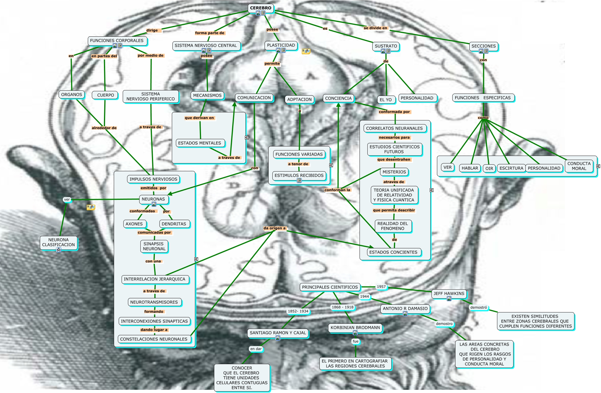 Este Cmap, tiene información relacionada con: El cerebro, TEORIA UNIFICADA DE RELATIVIDAD Y FISICA CUANTICA que permita describir REALIDAD DEL FENOMENO, AXONES comunicadas por DENDRITAS, CEREBRO posee PLASTICIDAD, CEREBRO es SUSTRATO, MISTERIOS atraves de TEORIA UNIFICADA DE RELATIVIDAD Y FISICA CUANTICA, FUNCIONES ESPECIFICAS como CONDUCTA MORAL, KORBINIAN BRODMANN fue EL PRIMERO EN CARTOGRAFIAR LAS REGIONES CEREBRALES, COMUNICACION con NEURONAS, INTERRELACION JERARQUICA a traves de NEUROTRANSMISORES, FUNCIONES VARIADAS a tenor de ESTIMULOS RECIBIDOS, SISTEMA NERVIOSO CENTRAL posee MECANISMOS, CEREBRO se divide en SECCIONES, NEURONAS por DENDRITAS, FUNCIONES ESPECIFICAS como HABLAR, ESTADOS MENTALES a traves de COMUNICACION, FUNCIONES ESPECIFICAS como VER, JEFF HAWKINS demostró EXISTEN SIMILITUDES ENTRE ZONAS CEREBRALES QUE CUMPLEN FUNCIONES DIFERENTES, SECCIONES con FUNCIONES ESPECIFICAS, SUSTRATO de PERSONALIDAD, PRINCIPALES CIENTIFICOS 1868 - 1918 KORBINIAN BRODMANN