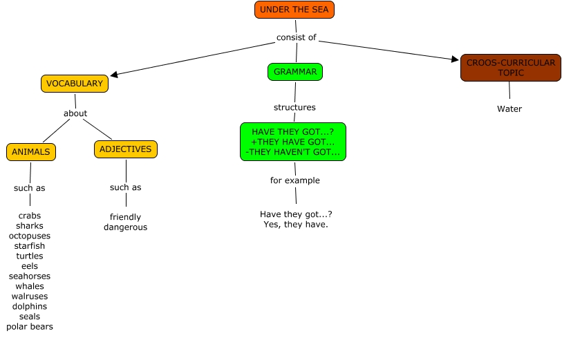 Este Cmap, tiene información relacionada con: UNDER THE SEA-Óscar, UNDER THE SEA consist of CROOS-CURRICULAR TOPIC, UNDER THE SEA consist of GRAMMAR, ANIMALS such as crabs sharks octopuses starfish turtles eels seahorses whales walruses dolphins seals polar bears, ADJECTIVES such as friendly dangerous, VOCABULARY about ADJECTIVES, HAVE THEY GOT...? +THEY HAVE GOT... -THEY HAVEN'T GOT... for example Have they got...? Yes, they have., CROOS-CURRICULAR TOPIC ???? Water, GRAMMAR structures HAVE THEY GOT...? +THEY HAVE GOT... -THEY HAVEN'T GOT..., VOCABULARY about ANIMALS, UNDER THE SEA consist of VOCABULARY