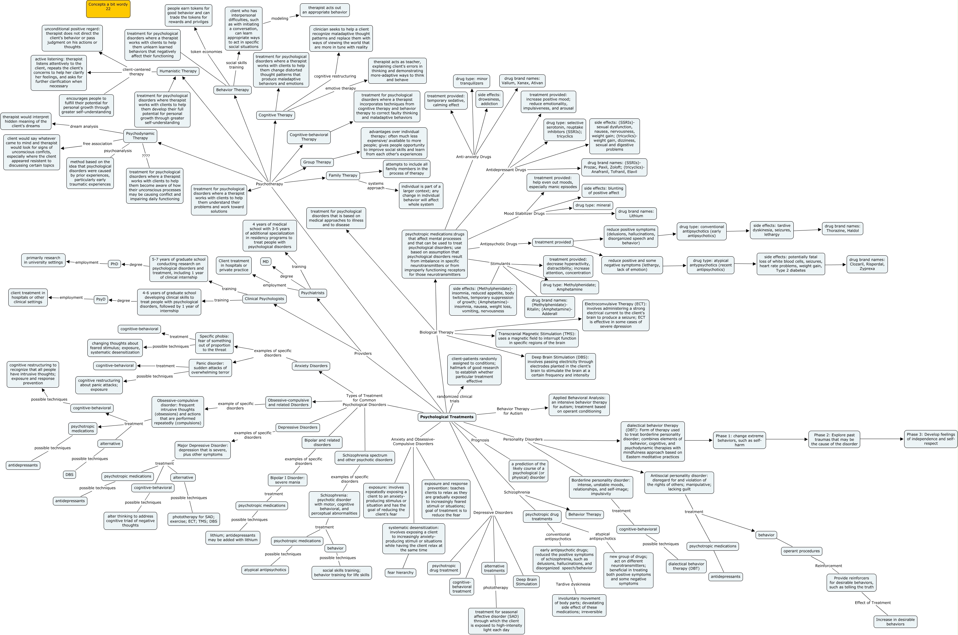 This Concept Map, created with IHMC CmapTools, has information related to: Ch14 cmap_Larimer 22, psychotropic medications:drugs that affect mental processes and that can be used to treat psychological disorders; use based on assumption that psychological disorders result from imbalance in specific neurotransmitters or from improperly functioning receptors for those neurotransmitters Mood Stabilizer Drugs drug brand names: Lithium, Psychological Treatments Biological Therapy Transcranial Magnetic Stimulation (TMS): uses a magnetic field to interrupt function in specific regions of the brain, Obsessive-compulsive disorder: frequent intrusive thoughts (obsessions) and actions that are performed repeatedly (compulsions) treatment alternative, Psychiatrists employment Client treatment in hospitals or private practice, Psychological Treatments Biological Therapy psychotropic medications:drugs that affect mental processes and that can be used to treat psychological disorders; use based on assumption that psychological disorders result from imbalance in specific neurotransmitters or from improperly functioning receptors for those neurotransmitters, psychotropic medications antidepressants, Major Depressive Disorder: depression that is severe, plus other symptoms treatment psychotropic medications, Psychological Treatments Biological Therapy Deep Brain Stimulation (DBS): involves passing electricity through electrodes planted in the client's brain to stimulate the brain at a certain frequency and intensity, Psychological Treatments Schizophrenia Behavior Therapy, Psychological Treatments Personality Disorders dialectical behavior therapy (DBT): Form of therapy used to treat borderline personality disorder; combines elements of behavior, cognitive, and psychodynamic therapies with mindfulness approach based on Eastern meditative practices, drug type: atypical antypsychotics (recent antipsychotics) side effects: potentially fatal loss of white blood cells, seizures, heart rate problems, weight gain, Type 2 diabetes, Schizophrenia: psychotic disorder with motor, cognitive behavioral, and perceptual abnormalities treatment psychotropic medications, Psychodynamic Therapy free association client would say whatever came to mind and therapist would look for signs of unconscious conflcts, especially where the client appeared resistent to discussing certain topics, Borderline personality disorder: intense, unstable moods, relationships, and self-image; impulsivity treatment cognitive-behavioral, Psychological Treatments Prognosis a prediction of the likely course of a psychological (or physical) disorder, Psychological Treatments Psychotherapy Group Therapy, Psychological Treatments Biological Therapy treatment for psychological disorders that is based on medical approaches to illness and to disease, Phase 2: Explore past traumas that may be the cause of the disorder Phase 3: Develop feelings of independence and self- respect, operant procedures Reinforcement Provide reinforcers for desirable behaviors, such as telling the truth, Antisocial personality disorder: disregard for and violation of the rights of others; manipulative; lacking guilt treatment psychotropic medications