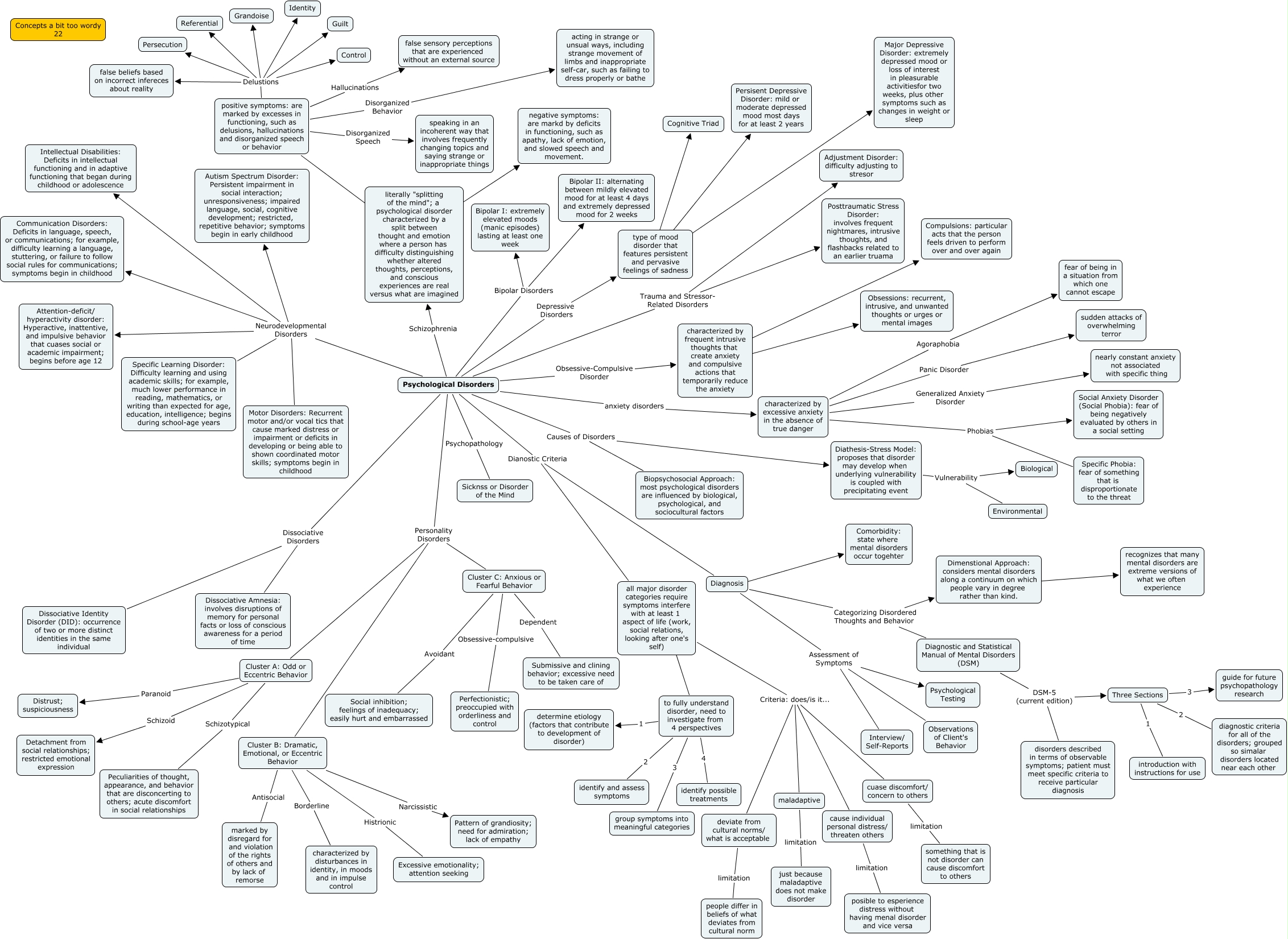 This Concept Map, created with IHMC CmapTools, has information related to: Ch13 cmap_Larimer 22, positive symptoms: are marked by excesses in functioning, such as delusions, hallucinations and disorganized speech or behavior Disorganized Speech speaking in an incoherent way that involves frequently changing topics and saying strange or inappropriate things, Cluster B: Dramatic, Emotional, or Eccentric Behavior Borderline characterized by disturbances in identity, in moods and in impulse control, Psychological Disorders Personality Disorders Cluster B: Dramatic, Emotional, or Eccentric Behavior, all major disorder categories require symptoms interfere with at least 1 aspect of life (work, social relations, looking after one's self) Criteria: does/is it... cuase discomfort/ concern to others, Dimenstional Approach: considers mental disorders along a continuum on which people vary in degree rather than kind. recognizes that many mental disorders are extreme versions of what we often experience, Three Sections 1 introduction with instructions for use, Diathesis-Stress Model: proposes that disorder may develop when underlying vulnerability is coupled with precipitating event Vulnerability Environmental, Psychological Disorders Personality Disorders Cluster A: Odd or Eccentric Behavior, Diagnosis Categorizing Disordered Thoughts and Behavior Dimenstional Approach: considers mental disorders along a continuum on which people vary in degree rather than kind., type of mood disorder that features persistent and pervasive feelings of sadness Persisent Depressive Disorder: mild or moderate depressed mood most days for at least 2 years, Psychological Disorders Dissociative Disorders Dissociative Identity Disorder (DID): occurrence of two or more distinct identities in the same individual, positive symptoms: are marked by excesses in functioning, such as delusions, hallucinations and disorganized speech or behavior Delustions Guilt, Diagnosis Assessment of Symptoms Psychological Testing, Psychological Disorders Dianostic Criteria all major disorder categories require symptoms interfere with at least 1 aspect of life (work, social relations, looking after one's self), Cluster A: Odd or Eccentric Behavior Paranoid Distrust; suspiciousness, positive symptoms: are marked by excesses in functioning, such as delusions, hallucinations and disorganized speech or behavior Disorganized Behavior acting in strange or unsual ways, including strange movement of limbs and inappropriate self-car, such as failing to dress properly or bathe, Psychological Disorders Depressive Disorders type of mood disorder that features persistent and pervasive feelings of sadness, positive symptoms: are marked by excesses in functioning, such as delusions, hallucinations and disorganized speech or behavior Delustions false beliefs based on incorrect infereces about reality, Psychological Disorders Neurodevelopmental Disorders Motor Disorders: Recurrent motor and/or vocal tics that cause marked distress or impairment or deficits in developing or being able to shown coordinated motor skills; symptoms begin in childhood, characterized by excessive anxiety in the absence of true danger Phobias Social Anxiety Disorder (Social Phobia): fear of being negatively evaluated by others in a social setting