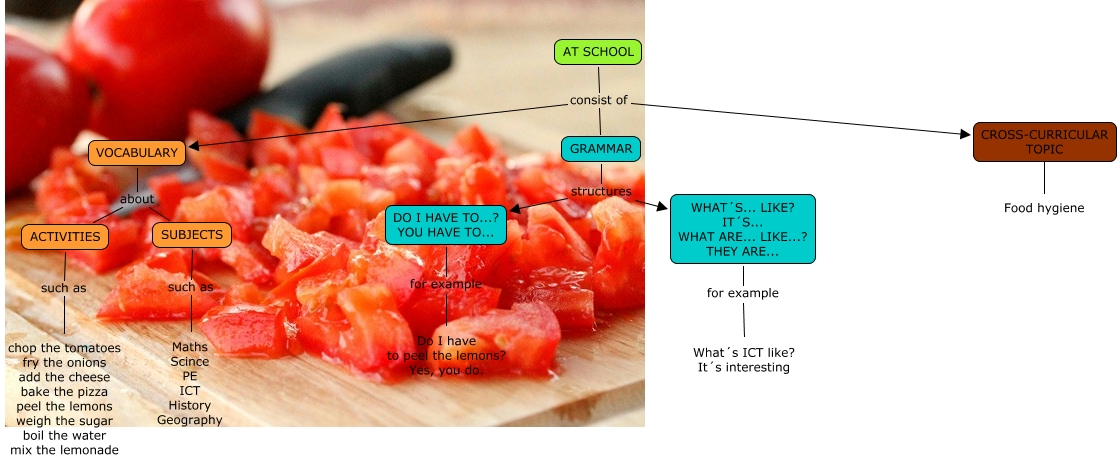 Este Cmap, tiene información relacionada con: AT SCHOOL-(Marcos y Manuel), AT SCHOOL consist of GRAMMAR, GRAMMAR structures WHAT´S... LIKE? IT´S... WHAT ARE... LIKE...? THEY ARE..., AT SCHOOL consist of VOCABULARY, VOCABULARY about SUBJECTS, DO I HAVE TO...? YOU HAVE TO... for example Do I have to peel the lemons? Yes, you do., CROSS-CURRICULAR TOPIC ???? Food hygiene, WHAT´S... LIKE? IT´S... WHAT ARE... LIKE...? THEY ARE... for example What´s ICT like? It´s interesting, VOCABULARY about ACTIVITIES, SUBJECTS such as Maths Scince PE ICT History Geography, AT SCHOOL consist of CROSS-CURRICULAR TOPIC, ACTIVITIES such as chop the tomatoes fry the onions add the cheese bake the pizza peel the lemons weigh the sugar boil the water mix the lemonade, GRAMMAR structures DO I HAVE TO...? YOU HAVE TO...