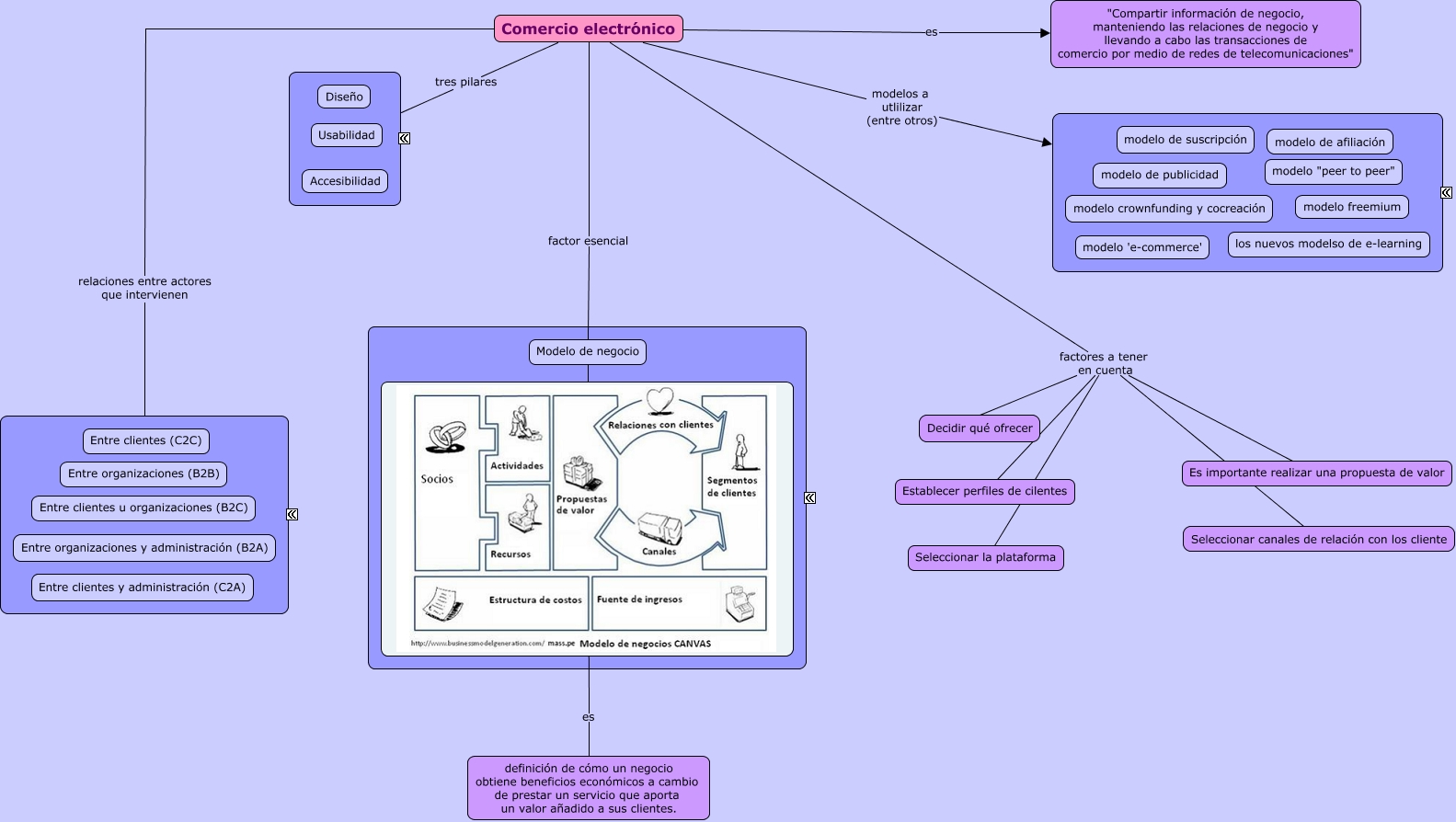 Este Cmap, tiene información relacionada con: Comercio Electrónico, Comercio electrónico modelos a utlilizar (entre otros) ????, Comercio electrónico es "Compartir información de negocio, manteniendo las relaciones de negocio y llevando a cabo las transacciones de comercio por medio de redes de telecomunicaciones", Comercio electrónico relaciones entre actores que intervienen ????, Comercio electrónico factor esencial Modelo de negocio, Comercio electrónico factores a tener en cuenta Seleccionar canales de relación con los cliente, Comercio electrónico factores a tener en cuenta Es importante realizar una propuesta de valor, Comercio electrónico factores a tener en cuenta Establecer perfiles de cilentes, Modelo de negocio es definición de cómo un negocio obtiene beneficios económicos a cambio de prestar un servicio que aporta un valor añadido a sus clientes., Comercio electrónico tres pilares ????, Comercio electrónico factores a tener en cuenta Seleccionar la plataforma, Comercio electrónico factores a tener en cuenta Decidir qué ofrecer