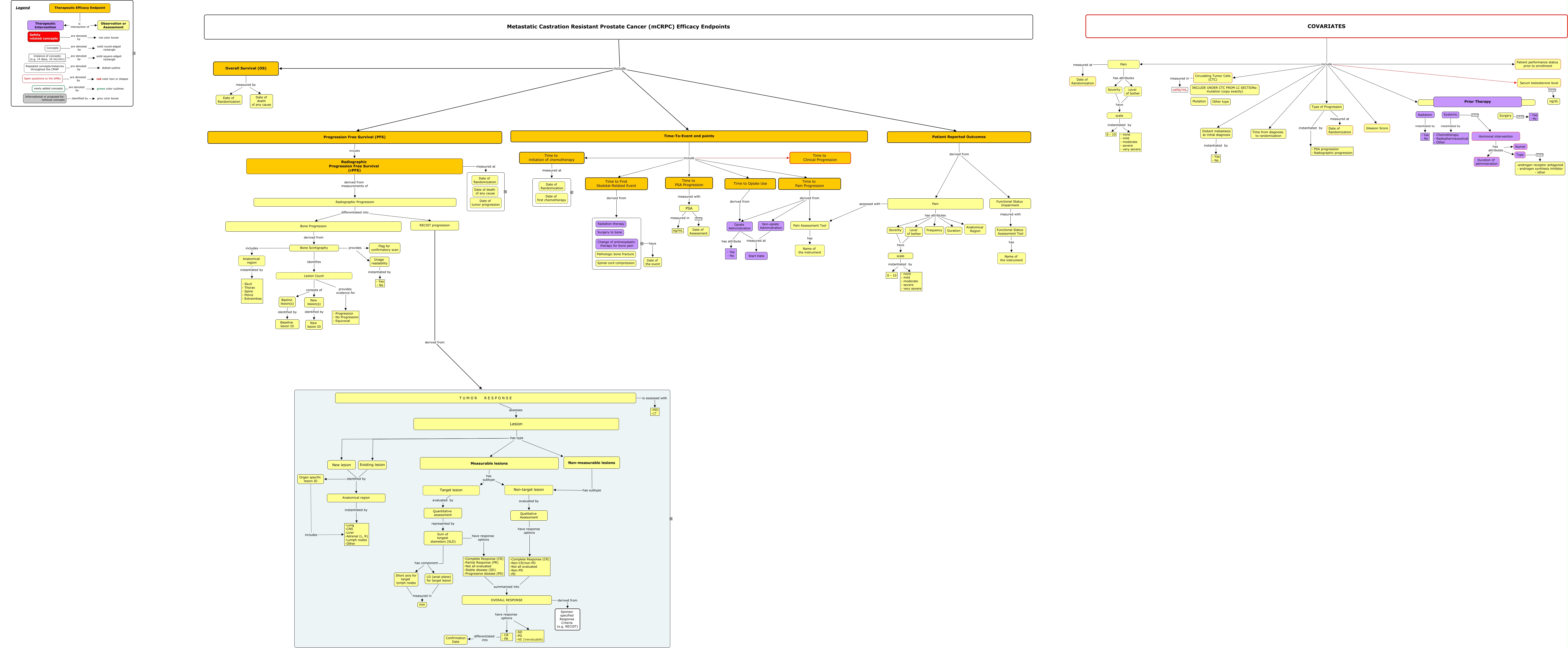 This Concept Map, created with IHMC CmapTools, has information related to: Prostate Cancer Efficacy Endpoints_v8, Systemic ???? Hormonal intervention, COVARIATES include Serum testosterone level, - CR - PR differentiated into Confirmation Date, Anatomical region instantiated by -Lung -CNS -Liver -Adrenal (L, R) -Lymph nodes -Other, COVARIATES include Type of Progression, Non-opiate Administration measured at Start Date, Bone Scintigraphy provides Image readability, Type ???? -androgen receptor antagonist - androgen synthesis inhibitor - other, Target lesion evaluated by Quantitative assessment, Hormonal intervention has attributes Duration of administration, OVERALL RESPONSE derived from Sponsor specified Response Criteria (e.g. RECIST), Functional Status Impairment masured with Functional Status Assessment Tool, Sum of longest diameters (SLD) has component LD (axial plane) for target lesion, Time-To-Event end points include Time to initiation of chemotherapy, Basline lesion(s) identified by Baseline lesion ID, -Complete Response (CR) -Non-CR/non-PD -Not all evaluated -Non-PD -PD summarized into OVERALL RESPONSE, T U M O R R E S P O N S E is assessed with -MRI -CT, Progression Free Survival (PFS) includes Radiographic Progression Free Survival (rPFS), Non-target lesion evaluated by Qualitative Assessment, New lesion identified by Organ specific lesion ID