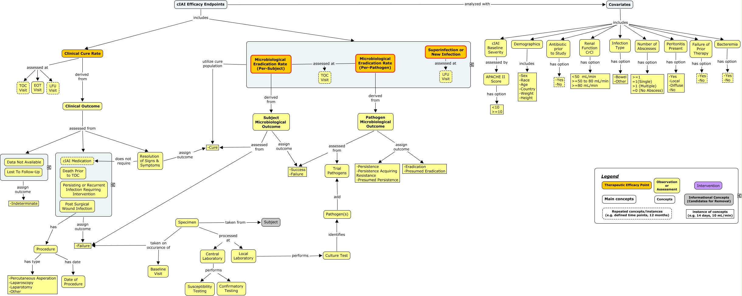 This Concept Map, created with IHMC CmapTools, has information related to: cIAI Efficacy Endpoints v2, Clinical Cure Rate assessed at EOT Visit, Pathogen Microbiological Outcome assessed from -Success -Failure, cIAI Efficacy Endpoints includes Clinical Cure Rate, Central Laboratory performs Susceptibility Testing, Clinical Cure Rate assessed at TOC Visit, Specimen processed at Central Laboratory, Covariates includes Renal Function CrCl, Covariates includes cIAI Baseline Severity, Pathogen(s) add Trial Pathogens, Subject Microbiological Outcome assessed from -Failure, Bacteremia has option -Yes -No, cIAI Efficacy Endpoints includes ????, Clinical Cure Rate assessed at LFU Visit, Number of Abscesses has option >=1 =1(Single) ɭ (Multiple) =0 (No Abscess), Subject Microbiological Outcome assign outcome -Success -Failure, Covariates includes Bacteremia, Specimen taken from Subject, Antibiotic prior to Study has option -Yes -No, APACHE II Score has option >=10, Resolution of Signs & Symptoms assign outcome -Cure