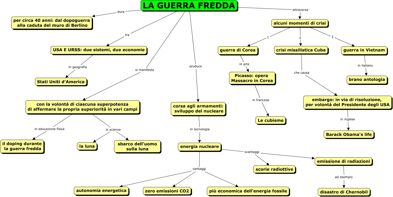 Questa Cmap, creata con IHMC CmapTools, contiene informazioni relative a: Diana OK!, LA GUERRA FREDDA dura per circa 40 anni: dal dopoguerra alla caduta del muro di Berlino, con la volontà di ciascuna superpotenza di affermare la propria superiorità in vari campi in educazione fisica il doping durante la guerra fredda, con la volontà di ciascuna superpotenza di affermare la propria superiorità in vari campi in scienze sbarco dell'uomo sulla luna, energia nucleare svantaggi emissione di radiazioni, USA E URSS: due sistemi, due economie in geografia Stati Uniti d'America, con la volontà di ciascuna superpotenza di affermare la propria superiorità in vari campi in scienze la luna, energia nucleare vantaggi zero emissioni CO2, guerra in Vietnam in italiano brano antologia, alcuni momenti di crisi 2 crisi missilistica Cuba, corsa agli armamenti: sviluppo del nucleare in tecnologia energia nucleare, crisi missilistica Cuba che causa embargo: in via di risoluzione, per volontà del Presidente degli USA, LA GUERRA FREDDA attraversa alcuni momenti di crisi, alcuni momenti di crisi 1 guerra di Corea, Picasso: opera Massacro in Corea in francese Le cubisme, LA GUERRA FREDDA si manifesta con la volontà di ciascuna superpotenza di affermare la propria superiorità in vari campi, embargo: in via di risoluzione, per volontà del Presidente degli USA in inglese Barack Obama's life, LA GUERRA FREDDA tra USA E URSS: due sistemi, due economie, energia nucleare vantaggi autonomia energetica, LA GUERRA FREDDA produce corsa agli armamenti: sviluppo del nucleare, alcuni momenti di crisi 3 guerra in Vietnam