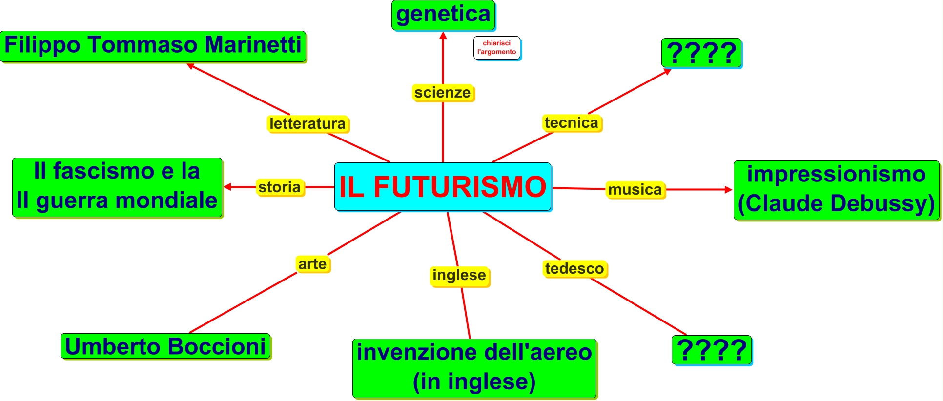 Questa Cmap, creata con IHMC CmapTools, contiene informazioni relative a: Coari Francesca mappa d'esame.cmap, IL FUTURISMO letteratura Filippo Tommaso Marinetti, IL FUTURISMO inglese invenzione dell'aereo (in inglese), IL FUTURISMO musica impressionismo (Claude Debussy), IL FUTURISMO arte Umberto Boccioni, IL FUTURISMO tedesco ????, IL FUTURISMO scienze genetica, IL FUTURISMO tecnica ????, IL FUTURISMO storia Il fascismo e la II guerra mondiale