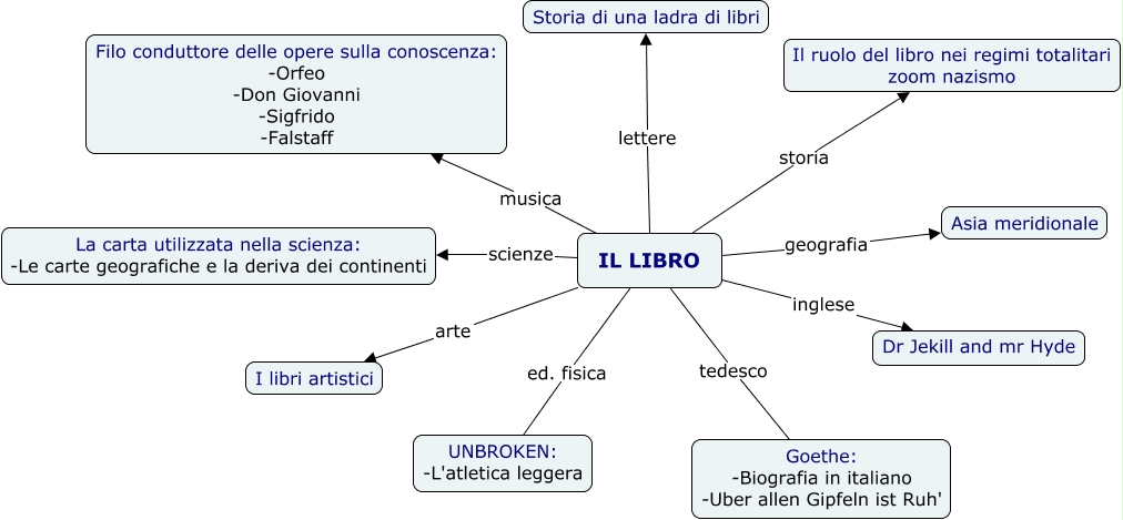 Questa Cmap, creata con IHMC CmapTools, contiene informazioni relative a: Valentina Ugenti mappa esame, IL LIBRO tedesco Goethe: -Biografia in italiano -Uber allen Gipfeln ist Ruh', IL LIBRO scienze La carta utilizzata nella scienza: -Le carte geografiche e la deriva dei continenti, IL LIBRO ed. fisica UNBROKEN: -L'atletica leggera, IL LIBRO inglese Dr Jekill and mr Hyde, IL LIBRO musica Filo conduttore delle opere sulla conoscenza: -Orfeo -Don Giovanni -Sigfrido -Falstaff, IL LIBRO arte I libri artistici, IL LIBRO geografia Asia meridionale, IL LIBRO storia Il ruolo del libro nei regimi totalitari zoom nazismo, IL LIBRO lettere Storia di una ladra di libri