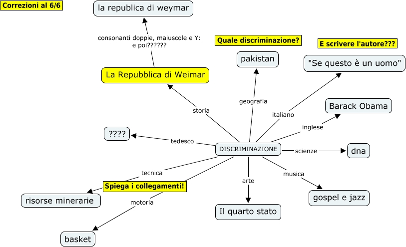 Questa Cmap, creata con IHMC CmapTools, contiene informazioni relative a: guido rossetti, DISCRIMINAZIONE tecnica risorse minerarie, DISCRIMINAZIONE musica gospel e jazz, La Repubblica di Weimar consonanti doppie, maiuscole e Y: e poi?????? la republica di weymar, DISCRIMINAZIONE scienze dna, DISCRIMINAZIONE arte Il quarto stato, DISCRIMINAZIONE inglese Barack Obama, DISCRIMINAZIONE storia La Repubblica di Weimar, DISCRIMINAZIONE motoria basket, DISCRIMINAZIONE tedesco ????, DISCRIMINAZIONE italiano "Se questo è un uomo", DISCRIMINAZIONE geografia pakistan