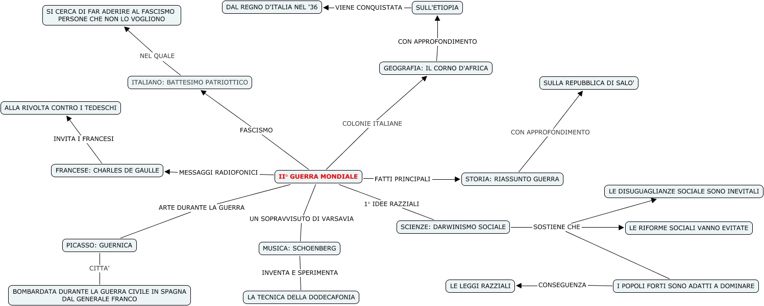 Questa Cmap, creata con IHMC CmapTools, contiene informazioni relative a: Nasti OK!, II° GUERRA MONDIALE 1° IDEE RAZZIALI SCIENZE: DARWINISMO SOCIALE, II° GUERRA MONDIALE FASCISMO ITALIANO: BATTESIMO PATRIOTTICO, II° GUERRA MONDIALE UN SOPRAVVISUTO DI VARSAVIA MUSICA: SCHOENBERG, SCIENZE: DARWINISMO SOCIALE SOSTIENE CHE LE RIFORME SOCIALI VANNO EVITATE, SCIENZE: DARWINISMO SOCIALE SOSTIENE CHE I POPOLI FORTI SONO ADATTI A DOMINARE, GEOGRAFIA: IL CORNO D'AFRICA CON APPROFONDIMENTO SULL'ETIOPIA, PICASSO: GUERNICA CITTA' BOMBARDATA DURANTE LA GUERRA CIVILE IN SPAGNA DAL GENERALE FRANCO, MUSICA: SCHOENBERG INVENTA E SPERIMENTA LA TECNICA DELLA DODECAFONIA, II° GUERRA MONDIALE COLONIE ITALIANE GEOGRAFIA: IL CORNO D'AFRICA, II° GUERRA MONDIALE MESSAGGI RADIOFONICI FRANCESE: CHARLES DE GAULLE, I POPOLI FORTI SONO ADATTI A DOMINARE CONSEGUENZA LE LEGGI RAZZIALI, II° GUERRA MONDIALE FATTI PRINCIPALI STORIA: RIASSUNTO GUERRA, FRANCESE: CHARLES DE GAULLE INVITA I FRANCESI ALLA RIVOLTA CONTRO I TEDESCHI, STORIA: RIASSUNTO GUERRA CON APPROFONDIMENTO SULLA REPUBBLICA DI SALO', SCIENZE: DARWINISMO SOCIALE SOSTIENE CHE LE DISUGUAGLIANZE SOCIALE SONO INEVITALI, ITALIANO: BATTESIMO PATRIOTTICO NEL QUALE SI CERCA DI FAR ADERIRE AL FASCISMO PERSONE CHE NON LO VOGLIONO, SULL'ETIOPIA VIENE CONQUISTATA DAL REGNO D'ITALIA NEL '36, II° GUERRA MONDIALE ARTE DURANTE LA GUERRA PICASSO: GUERNICA