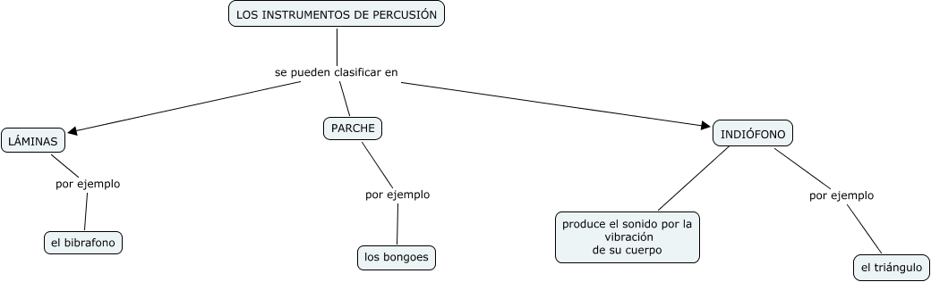 Este Cmap, tiene información relacionada con: LOS INSTRUMENTOS DE PERCUSIÓN-Lucía G, INDIÓFONO ???? produce el sonido por la vibración de su cuerpo, LOS INSTRUMENTOS DE PERCUSIÓN se pueden clasificar en LÁMINAS, INDIÓFONO por ejemplo el triángulo, LÁMINAS por ejemplo el bibrafono, LOS INSTRUMENTOS DE PERCUSIÓN se pueden clasificar en INDIÓFONO, PARCHE por ejemplo los bongoes, LOS INSTRUMENTOS DE PERCUSIÓN se pueden clasificar en PARCHE