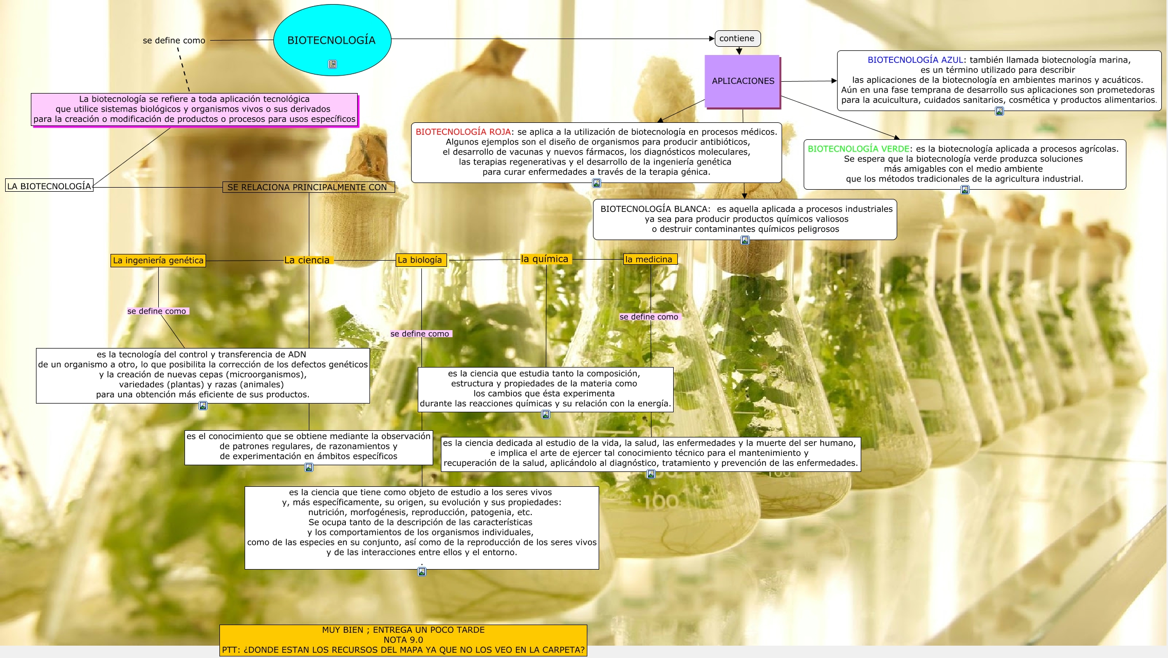 Este Cmap, tiene información relacionada con: BIOTECNOLOGÍA, APLICACIONES Y DERIVADAS, la medicina se define como es la ciencia dedicada al estudio de la vida, la salud, las enfermedades y la muerte del ser humano, e implica el arte de ejercer tal conocimiento técnico para el mantenimiento y recuperación de la salud, aplicándolo al diagnóstico, tratamiento y prevención de las enfermedades., contiene APLICACIONES BIOTECNOLOGÍA ROJA: se aplica a la utilización de biotecnología en procesos médicos. Algunos ejemplos son el diseño de organismos para producir antibióticos, el desarrollo de vacunas y nuevos fármacos, los diagnósticos moleculares, las terapias regenerativas y el desarrollo de la ingeniería genética para curar enfermedades a través de la terapia génica., SE RELACIONA PRINCIPALMENTE CON La ciencia La ingeniería genética, La biología se define como es la ciencia que tiene como objeto de estudio a los seres vivos y, más específicamente, su origen, su evolución y sus propiedades: nutrición, morfogénesis, reproducción, patogenia, etc. Se ocupa tanto de la descripción de las características y los comportamientos de los organismos individuales, como de las especies en su conjunto, así como de la reproducción de los seres vivos y de las interacciones entre ellos y el entorno. ., contiene APLICACIONES BIOTECNOLOGÍA AZUL: también llamada biotecnología marina, es un término utilizado para describir las aplicaciones de la biotecnología en ambientes marinos y acuáticos. Aún en una fase temprana de desarrollo sus aplicaciones son prometedoras para la acuicultura, cuidados sanitarios, cosmética y productos alimentarios., es la ciencia que estudia tanto la composición, estructura y propiedades de la materia como los cambios que ésta experimenta durante las reacciones químicas y su relación con la energía. la química la medicina, BIOTECNOLOGÍA se define como La biotecnología se refiere a toda aplicación tecnológica que utilice sistemas biológicos y organismos vivos o sus derivados para la creación o modificación de productos o procesos para usos específicos, La biología la química la medicina, contiene APLICACIONES BIOTECNOLOGÍA VERDE: es la biotecnología aplicada a procesos agrícolas. Se espera que la biotecnología verde produzca soluciones más amigables con el medio ambiente que los métodos tradicionales de la agricultura industrial., BIOTECNOLOGÍA ???? contiene, SE RELACIONA PRINCIPALMENTE CON La ciencia La biología, SE RELACIONA PRINCIPALMENTE CON La ciencia es el conocimiento que se obtiene mediante la observación de patrones regulares, de razonamientos y de experimentación en ámbitos específicos, contiene APLICACIONES BIOTECNOLOGÍA BLANCA: es aquella aplicada a procesos industriales ya sea para producir productos químicos valiosos o destruir contaminantes químicos peligrosos, La ingeniería genética se define como es la tecnología del control y transferencia de ADN de un organismo a otro, lo que posibilita la corrección de los defectos genéticos y la creación de nuevas cepas (microorganismos), variedades (plantas) y razas (animales) para una obtención más eficiente de sus productos., SE RELACIONA PRINCIPALMENTE CON La biotecnología se refiere a toda aplicación tecnológica que utilice sistemas biológicos y organismos vivos o sus derivados para la creación o modificación de productos o procesos para usos específicos
