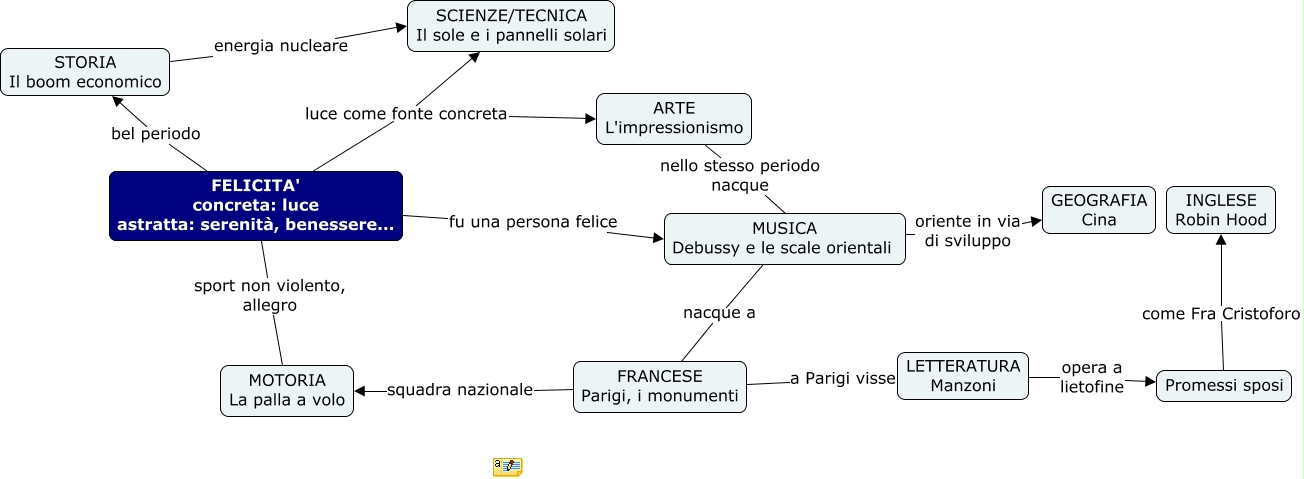 Questa Cmap, creata con IHMC CmapTools, contiene informazioni relative a: mappa d'esame diletta ormellese, STORIA Il boom economico energia nucleare SCIENZE/TECNICA Il sole e i pannelli solari, FRANCESE Parigi, i monumenti squadra nazionale MOTORIA La palla a volo, Promessi sposi come Fra Cristoforo INGLESE Robin Hood, FELICITA' concreta: luce astratta: serenità, benessere... bel periodo STORIA Il boom economico, MUSICA Debussy e le scale orientali nacque a FRANCESE Parigi, i monumenti, FRANCESE Parigi, i monumenti a Parigi visse LETTERATURA Manzoni, FELICITA' concreta: luce astratta: serenità, benessere... luce come fonte concreta ARTE L'impressionismo, LETTERATURA Manzoni opera a lietofine Promessi sposi, FELICITA' concreta: luce astratta: serenità, benessere... fu una persona felice MUSICA Debussy e le scale orientali, FELICITA' concreta: luce astratta: serenità, benessere... sport non violento, allegro MOTORIA La palla a volo, FELICITA' concreta: luce astratta: serenità, benessere... luce come fonte concreta SCIENZE/TECNICA Il sole e i pannelli solari, MUSICA Debussy e le scale orientali oriente in via di sviluppo GEOGRAFIA Cina, ARTE L'impressionismo nello stesso periodo nacque MUSICA Debussy e le scale orientali