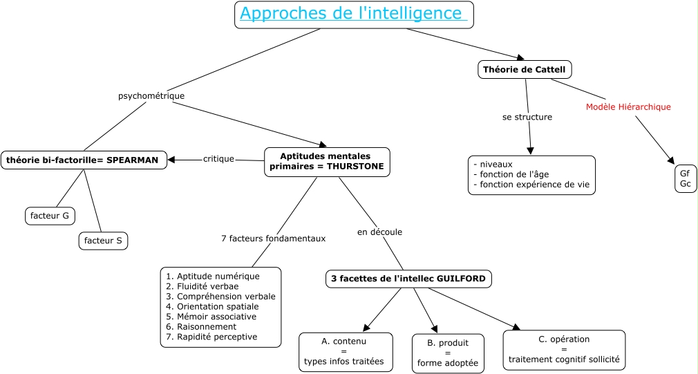 Cette carte de concepts créée avec IHMC CmapTools traite de: approches intel, Théorie de Cattell Modèle Hiérarchique Gf Gc, Approches de l'intelligence Théorie de Cattell, Approches de l'intelligence psychométrique théorie bi-factorille= SPEARMAN, Aptitudes mentales primaires = THURSTONE critique théorie bi-factorille= SPEARMAN, théorie bi-factorille= SPEARMAN facteur S, 3 facettes de l'intellec GUILFORD C. opération = traitement cognitif sollicité, 3 facettes de l'intellec GUILFORD A. contenu = types infos traitées, Aptitudes mentales primaires = THURSTONE 7 facteurs fondamentaux 1. Aptitude numérique 2. Fluidité verbae 3. Compréhension verbale 4. Orientation spatiale 5. Mémoir associative 6. Raisonnement 7. Rapidité perceptive, Aptitudes mentales primaires = THURSTONE en découle 3 facettes de l'intellec GUILFORD, Approches de l'intelligence psychométrique Aptitudes mentales primaires = THURSTONE, Théorie de Cattell se structure - niveaux - fonction de l'âge - fonction expérience de vie, théorie bi-factorille= SPEARMAN facteur G, 3 facettes de l'intellec GUILFORD B. produit = forme adoptée