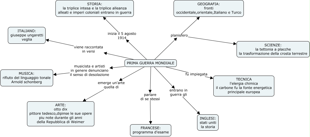 Questa Cmap, creata con IHMC CmapTools, contiene informazioni relative a: senuda mendis, PRIMA GUERRA MONDIALE musicista e artisti in genere denunciano il senso di desolazione MUSICA: rifiuto del linguaggio tonale Arnold schonberg, PRIMA GUERRA MONDIALE fu impiegata TECNICA l'elergia chimica il carbone fu la fonte energetica principale europea, PRIMA GUERRA MONDIALE planisfero SCIENZE: la tettonia a placche la trasformazione della crosta terrestre, PRIMA GUERRA MONDIALE emerge un'arte quella di ARTE: otto dix pittore tedesco,dipinse le sue opere piu note durante gli anni della Repubblica di Weimer, PRIMA GUERRA MONDIALE entrano in guerra gli INGLESI: stati uniti la storia, PRIMA GUERRA MONDIALE inizia il 5 agosto 1914 STORIA: la triplice intesa e la triplice alleanza alleati e imperi coloniali entrano in guerra, PRIMA GUERRA MONDIALE planisfero GEOGRAFIA: fronti occidentale,orientale,Italiano e Turco, PRIMA GUERRA MONDIALE viene raccontata in versi ITALIANO: giuseppe ungaretti veglia, PRIMA GUERRA MONDIALE parlare di se stessi FRANCESE: programma d'esame