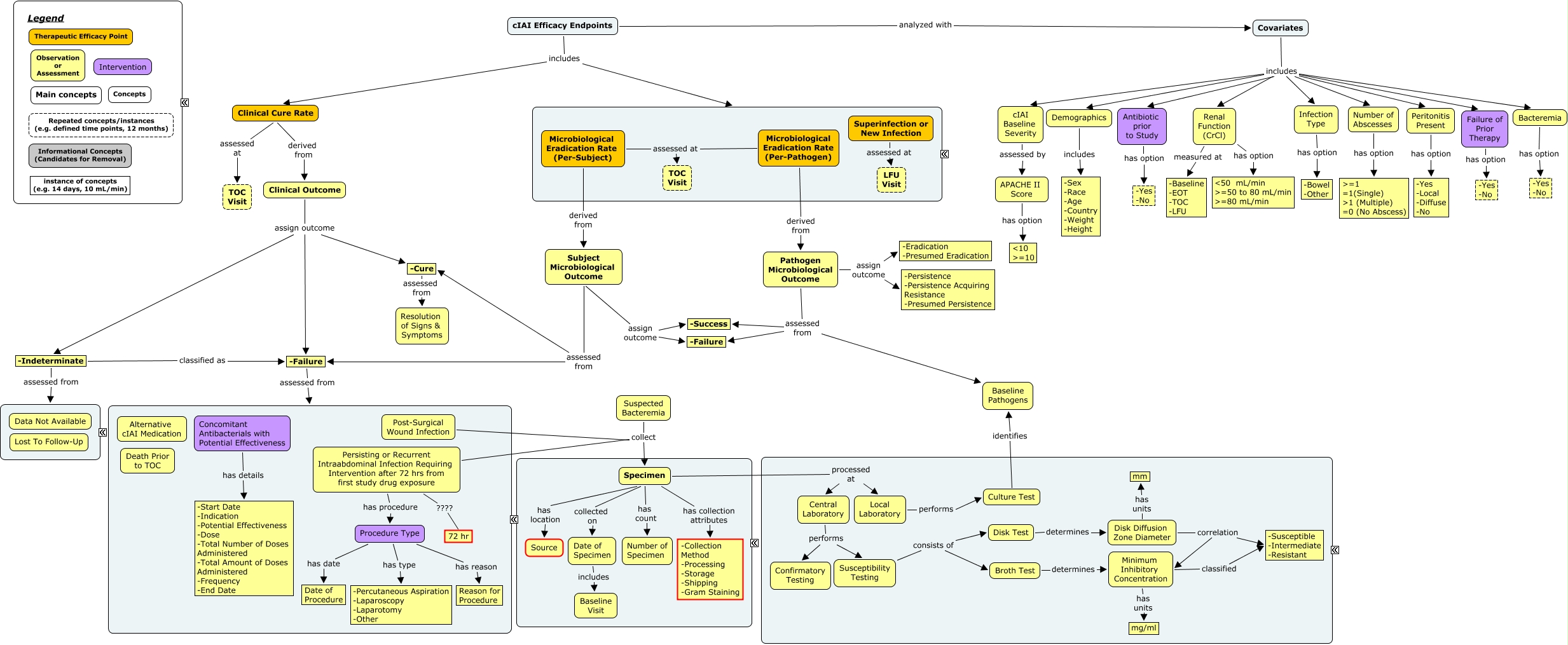 This Concept Map, created with IHMC CmapTools, has information related to: cIAI Efficacy Endpoints v4, Pathogen Microbiological Outcome assessed from -Success, Minimum Inhibitory Concentration has units mg/ml, cIAI Efficacy Endpoints includes Clinical Cure Rate, Disk Diffusion Zone Diameter has units mm, Central Laboratory performs Susceptibility Testing, Clinical Cure Rate assessed at TOC Visit, Covariates includes Renal Function (CrCl), Covariates includes cIAI Baseline Severity, Post-Surgical Wound Infection collect Specimen, -Failure assessed from ????, Bacteremia has option -Yes -No, Disk Diffusion Zone Diameter correlation -Susceptible -Intermediate -Resistant, cIAI Efficacy Endpoints includes ????, Culture Test identifies Baseline Pathogens, Number of Abscesses has option >=1 =1(Single) ɭ (Multiple) =0 (No Abscess), Subject Microbiological Outcome assign outcome -Success, -Indeterminate assessed from ????, Covariates includes Bacteremia, Susceptibility Testing consists of Disk Test, Antibiotic prior to Study has option -Yes -No