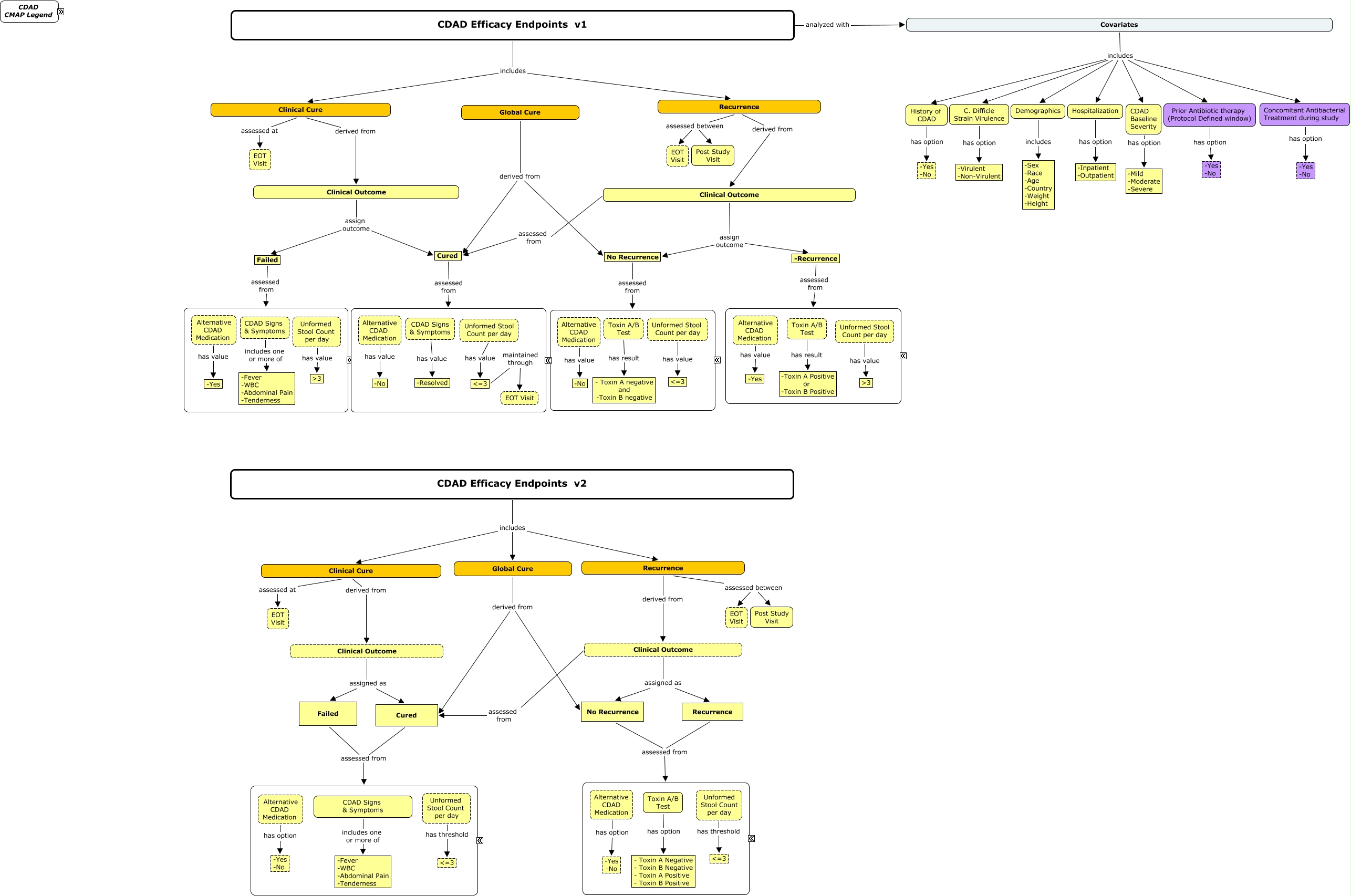 This Concept Map, created with IHMC CmapTools, has information related to: CDAD Efficacy Endpoints v4ak-bwm, -Recurrence assessed from ????, Recurrence assessed from ????, Clinical Outcome assigned as Recurrence, No Recurrence assessed from ????, Clinical Cure assessed at EOT Visit, CDAD Efficacy Endpoints v2 includes Global Cure, Alternative CDAD Medication has option -Yes -No, Unformed Stool Count per day has threshold <=3, Unformed Stool Count per day has value <=3, Toxin A/B Test has result -Toxin A Positive or -Toxin B Positive, Covariates includes Demographics, CDAD Signs & Symptoms has value -Resolved, Toxin A/B Test has option - Toxin A Negative - Toxin B Negative - Toxin A Positive - Toxin B Positive, Clinical Cure assessed at EOT Visit, History of CDAD has option -Yes -No, Clinical Outcome assigned as Failed, Clinical Outcome assessed from Cured, Alternative CDAD Medication has value -No, CDAD Signs & Symptoms includes one or more of -Fever -WBC -Abdominal Pain -Tenderness, C. Difficle Strain Virulence has option -Virulent -Non-Virulent