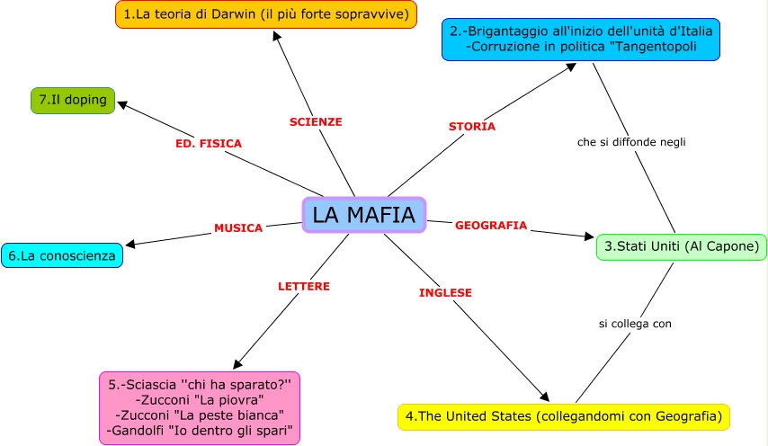 Questa Cmap, creata con IHMC CmapTools, contiene informazioni relative a: mappa d'esame isabella argentiero, 4.The United States (collegandomi con Geografia) si collega con 3.Stati Uniti (Al Capone), LA MAFIA MUSICA 6.La conoscienza, LA MAFIA ED. FISICA 7.Il doping, LA MAFIA INGLESE 4.The United States (collegandomi con Geografia), 2.-Brigantaggio all'inizio dell'unità d'Italia -Corruzione in politica "Tangentopoli che si diffonde negli 3.Stati Uniti (Al Capone), LA MAFIA SCIENZE 1.La teoria di Darwin (il più forte sopravvive), LA MAFIA LETTERE 5.-Sciascia ''chi ha sparato?'' -Zucconi "La piovra" -Zucconi "La peste bianca" -Gandolfi "Io dentro gli spari", LA MAFIA GEOGRAFIA 3.Stati Uniti (Al Capone), LA MAFIA STORIA 2.-Brigantaggio all'inizio dell'unità d'Italia -Corruzione in politica "Tangentopoli