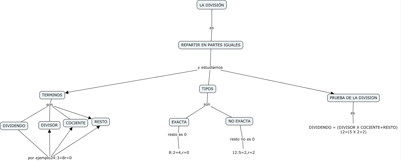 Este Cmap, tiene información relacionada con: LA DIVISIÓN- Unax y Naiara, PRUEBA DE LA DIVISION es DIVIDENDO = (DIVISOR X COCIENTE+RESTO) 12=(5 X 2+2), DIVIDENDO por ejemplo24:3=8r=0 DIVISOR, REPARTIR EN PARTES IGUALES y estudiamos TERMINOS, REPARTIR EN PARTES IGUALES y estudiamos PRUEBA DE LA DIVISION, TERMINOS son COCIENTE, TERMINOS son DIVISOR, DIVIDENDO por ejemplo24:3=8r=0 RESTO, TIPOS son EXACTA, TIPOS son NO EXACTA, TERMINOS son RESTO, DIVIDENDO por ejemplo24:3=8r=0 COCIENTE, EXACTA resto es 0 8:2=4,r=0, TERMINOS son DIVIDENDO, NO EXACTA resto no es 0 12:5=2,r=2, LA DIVISIÓN es REPARTIR EN PARTES IGUALES, REPARTIR EN PARTES IGUALES y estudiamos TIPOS