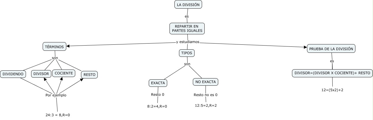 Este Cmap, tiene información relacionada con: LA DIVISIÓN=Daniel y Carmen, REPARTIR EN PARTES IGUALES y estudiamos TIPOS, LA DIVISIÓN es REPARTIR EN PARTES IGUALES, TÉRMINOS son DIVIDENDO, NO EXACTA Resto no es 0 12:5=2,R=2, TÉRMINOS son COCIENTE, DIVIDENDO Por ejemplo COCIENTE, REPARTIR EN PARTES IGUALES y estudiamos TÉRMINOS, EXACTA Resto 0 8:2=4,R=0, PRUEBA DE LA DIVISIÓN es 12=(5x2)+2, PRUEBA DE LA DIVISIÓN es DIVISOR=(DIVISOR X COCIENTE)+ RESTO, DIVIDENDO Por ejemplo RESTO, TIPOS son EXACTA, TÉRMINOS son DIVISOR, TIPOS son NO EXACTA, TÉRMINOS son RESTO, DIVIDENDO Por ejemplo DIVISOR, REPARTIR EN PARTES IGUALES y estudiamos PRUEBA DE LA DIVISIÓN, DIVIDENDO Por ejemplo 24:3 = 8,R=0