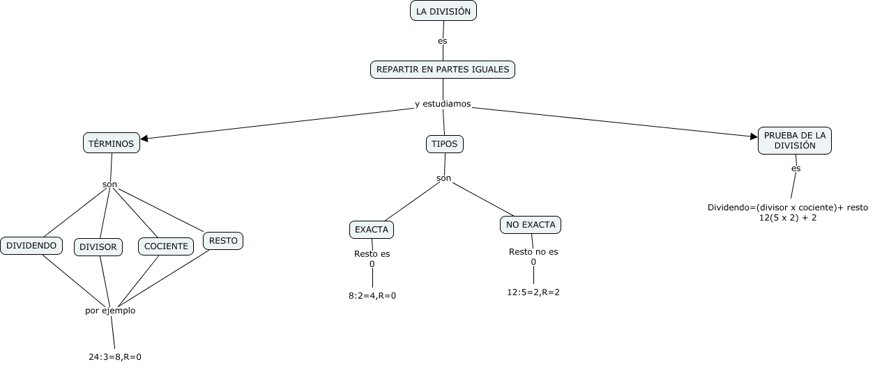 Este Cmap, tiene información relacionada con: LADIVISIÓN Irene y Lidia, COCIENTE por ejemplo 24:3=8,R=0, DIVISOR por ejemplo 24:3=8,R=0, NO EXACTA Resto no es 0 12:5=2,R=2, EXACTA Resto es 0 8:2=4,R=0, RESTO por ejemplo 24:3=8,R=0, TÉRMINOS son DIVIDENDO, PRUEBA DE LA DIVISIÓN es Dividendo=(divisor x cociente)+ resto 12(5 x 2) + 2, DIVIDENDO por ejemplo 24:3=8,R=0, TÉRMINOS son RESTO, TIPOS son NO EXACTA, REPARTIR EN PARTES IGUALES y estudiamos TÉRMINOS, REPARTIR EN PARTES IGUALES y estudiamos PRUEBA DE LA DIVISIÓN, TÉRMINOS son DIVISOR, TIPOS son EXACTA, LA DIVISIÓN es REPARTIR EN PARTES IGUALES, REPARTIR EN PARTES IGUALES y estudiamos TIPOS, TÉRMINOS son COCIENTE