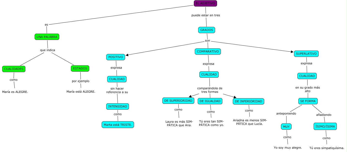 Este Cmap, tiene información relacionada con: EL ADJETIVO-Adriana, POSITIVO expresa CUALIDAD, EL ADJETIVO es UNA PALABRA, �?SIMO/�?SIMA como Tú eres simpatiquísima., CUALIDADES como María es ALEGRE., UNA PALABRA que indica CUALIDADES, CUALIDAD comparándola de tres formas DE SUPERIORIDAD, CUALIDAD comparándola de tres formas DE IGUALDAD, SE FORMA añadiendo �?SIMO/�?SIMA, SE FORMA anteponiendo MUY, DE INFERIORIDAD como Ariadna es menos SIM- P�?TICA que Lucía., CUALIDAD en su grado más alto SE FORMA, DE SUPERIORIDAD como Laura es más SIM- P�?TICA que Ana., COMPARATIVO expresa CUALIDAD, SUPERLATIVO expresa CUALIDAD, GRADOS son POSITIVO, MUY como Yo soy muy alegre., GRADOS son SUPERLATIVO, ESTADOS por ejemplo María está ALEGRE., UNA PALABRA que indica ESTADOS, INTENSIDAD como Marta está TRISTE.