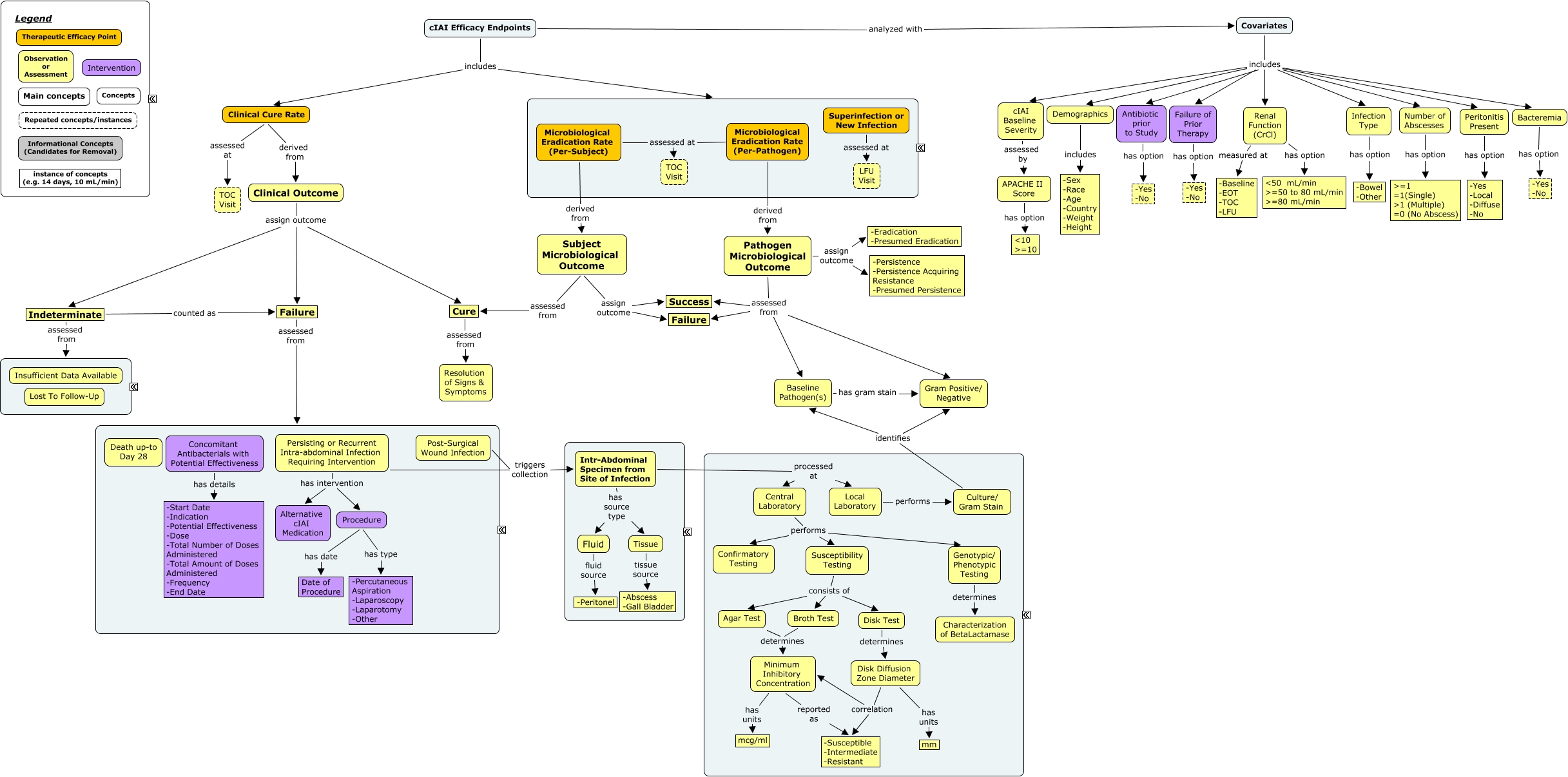 This Concept Map, created with IHMC CmapTools, has information related to: cIAI Efficacy Endpoints v6, Minimum Inhibitory Concentration has units mcg/ml, Pathogen Microbiological Outcome assessed from Success, Culture/ Gram Stain identifies Gram Positive/ Negative, Genotypic/ Phenotypic Testing determines Characterization of BetaLactamase, Susceptibility Testing consists of Agar Test, Disk Diffusion Zone Diameter has units mm, cIAI Efficacy Endpoints includes Clinical Cure Rate, Covariates includes Renal Function (CrCl), Clinical Cure Rate assessed at TOC Visit, Central Laboratory performs Susceptibility Testing, Failure assessed from ????, Post-Surgical Wound Infection triggers collection Intr-Abdominal Specimen from Site of Infection, Covariates includes cIAI Baseline Severity, Agar Test determines Minimum Inhibitory Concentration, Disk Diffusion Zone Diameter correlation -Susceptible -Intermediate -Resistant, Bacteremia has option -Yes -No, Culture/ Gram Stain identifies Baseline Pathogen(s), cIAI Efficacy Endpoints includes ????, Indeterminate assessed from ????, Subject Microbiological Outcome assign outcome Success