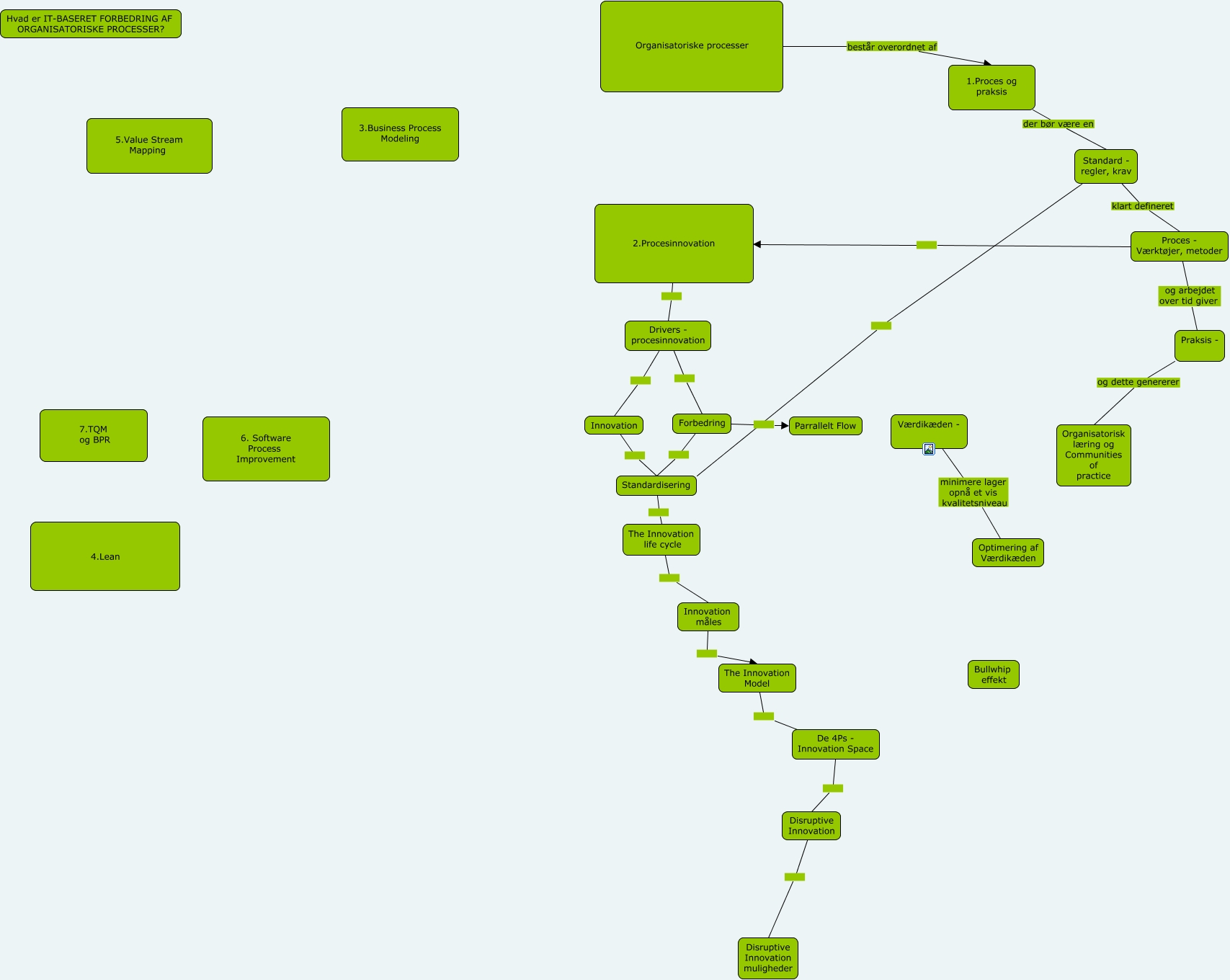 This Concept Map, created with IHMC CmapTools, has information related to: M5 - IT-Baseret Forbedring af Organisatoriske processer, Praksis - og dette genererer Organisatorisk læring og Communities of practice, Innovation ???? Standardisering, The Innovation Model ???? De 4Ps - Innovation Space, The Innovation life cycle ???? Innovation måles, Drivers - procesinnovation ???? Forbedring, Disruptive Innovation ???? Disruptive Innovation muligheder, Forbedring ???? Standardisering, Innovation måles ???? The Innovation Model, Proces - Værktøjer, metoder og arbejdet over tid giver Praksis -, Drivers - procesinnovation ???? Innovation, Standardisering ???? The Innovation life cycle, Standard - regler, krav klart defineret Proces - Værktøjer, metoder, Standard - regler, krav ???? Standardisering, Organisatoriske processer består overordnet af 1.Proces og praksis, Værdikæden - minimere lager opnå et vis kvalitetsniveau Optimering af Værdikæden, De 4Ps - Innovation Space ???? Disruptive Innovation, Forbedring ???? Parrallelt Flow, Proces - Værktøjer, metoder ???? 2.Procesinnovation, 2.Procesinnovation ???? Drivers - procesinnovation, 1.Proces og praksis der bør være en Standard - regler, krav