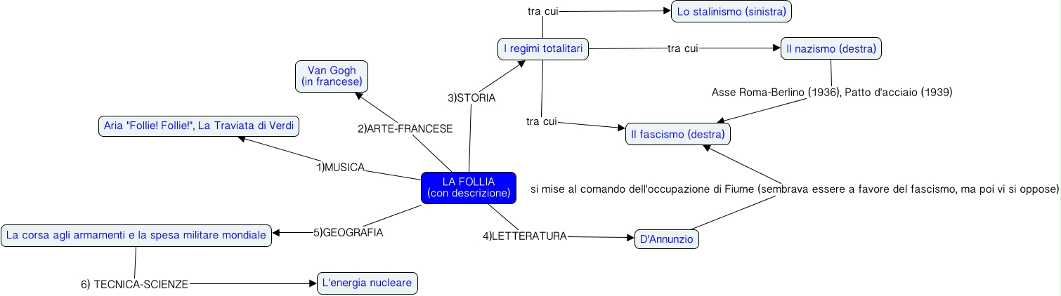 Questa Cmap, creata con IHMC CmapTools, contiene informazioni relative a: Mappa esame 5, LA FOLLIA (con descrizione) 4)LETTERATURA D'Annunzio, LA FOLLIA (con descrizione) 1)MUSICA Aria "Follie! Follie!", La Traviata di Verdi, La corsa agli armamenti e la spesa militare mondiale 6) TECNICA-SCIENZE L'energia nucleare, I regimi totalitari tra cui Il nazismo (destra), LA FOLLIA (con descrizione) 2)ARTE-FRANCESE Van Gogh (in francese), D'Annunzio si mise al comando dell'occupazione di Fiume (sembrava essere a favore del fascismo, ma poi vi si oppose) Il fascismo (destra), LA FOLLIA (con descrizione) 5)GEOGRAFIA La corsa agli armamenti e la spesa militare mondiale, I regimi totalitari tra cui Lo stalinismo (sinistra), LA FOLLIA (con descrizione) 3)STORIA I regimi totalitari, I regimi totalitari tra cui Il fascismo (destra), Il nazismo (destra) Asse Roma-Berlino (1936), Patto d'acciaio (1939) Il fascismo (destra)