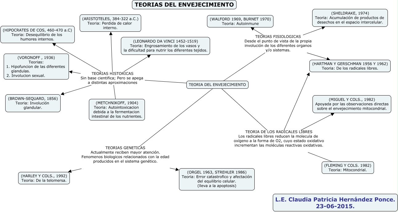 Este Cmap, tiene información relacionada con: memory CLAUDIA, TEORIA DEL ENVEJECIMIENTO TEORIA DE LOS RADICALES LIBRES Los radicales libres reducen la molecula de oxígeno a la forma de O2, cuyo estado oxidativo incrementan las moléculas reactivas oxidativas. (FLEMING Y COLS. 1982) Teoria: Mitocondrial., TEORIA DEL ENVEJECIMIENTO TEORIAS FISIOLOGICAS Desde el punto de vista de la propia involución de los diferentes organos y/o sistemas. (SHELDRAKE, 1974) Teoria: Acumulación de productos de desechos en el espacio intercelular., TEORIA DEL ENVEJECIMIENTO TEORIAS HISTORICAS Sin base cientifica; Pero se apega a distintas aproximaciones (ARISTOTELES, 384-322 a.C.) Teoria: Perdida de calor interno., TEORIA DEL ENVEJECIMIENTO TEORIAS FISIOLOGICAS Desde el punto de vista de la propia involución de los diferentes organos y/o sistemas. (HARTMAN Y GERSCHMAN 1956 Y 1962) Teoria: De los radicales libres., TEORIA DEL ENVEJECIMIENTO TEORIAS HISTORICAS Sin base cientifica; Pero se apega a distintas aproximaciones (HIPOCRATES DE COS, 460-470 a.C) Teoria: Desequilibrio de los humores internos., TEORIA DEL ENVEJECIMIENTO TEORIAS HISTORICAS Sin base cientifica; Pero se apega a distintas aproximaciones (METCHNIKOFF, 1904) Teoria: Autointoxicacion debida a la fermentacion intestinal de los nutrientes., TEORIA DEL ENVEJECIMIENTO TEORIAS FISIOLOGICAS Desde el punto de vista de la propia involución de los diferentes organos y/o sistemas. (WALFORD 1969, BURNET 1970) Teoria: Autoinmune, TEORIA DEL ENVEJECIMIENTO TEORIA DE LOS RADICALES LIBRES Los radicales libres reducen la molecula de oxígeno a la forma de O2, cuyo estado oxidativo incrementan las moléculas reactivas oxidativas. (HARTMAN Y GERSCHMAN 1956 Y 1962) Teoria: De los radicales libres., TEORIA DEL ENVEJECIMIENTO TEORIAS HISTORICAS Sin base cientifica; Pero se apega a distintas aproximaciones (LEONARDO DA VINCI 1452-1519) Teoria: Engrosamiento de los vasos y la dificultad para nutrir los diferentes tejidos., TEORIA DEL ENVEJECIMIENTO TEORIAS GENETICAS Actualmente reciben mayor atención. Fenomenos biologicos relacionados con la edad producidos en el sistema genético. (HARLEY Y COLS., 1992) Teoria: De la telomersa., TEORIA DEL ENVEJECIMIENTO TEORIAS HISTORICAS Sin base cientifica; Pero se apega a distintas aproximaciones (VORONOFF , 1936) Teorias: 1. Hipofuncion de las diferentes glandulas. 2. Involucion sexual., TEORIA DEL ENVEJECIMIENTO TEORIA DE LOS RADICALES LIBRES Los radicales libres reducen la molecula de oxígeno a la forma de O2, cuyo estado oxidativo incrementan las moléculas reactivas oxidativas. (MIGUEL Y COLS., 1982) Apoyada por las observaciones directas sobre el envejecimiento mitocondrial., TEORIA DEL ENVEJECIMIENTO TEORIAS GENETICAS Actualmente reciben mayor atención. Fenomenos biologicos relacionados con la edad producidos en el sistema genético. (ORGEL 1963, STREHLER 1986) Teoria: Error catastrofico y afectación del equilibrio celular. (lleva a la apoptosis), TEORIA DEL ENVEJECIMIENTO TEORIAS HISTORICAS Sin base cientifica; Pero se apega a distintas aproximaciones (BROWN-SEQUARD, 1856) Teoria: Involución glandular.
