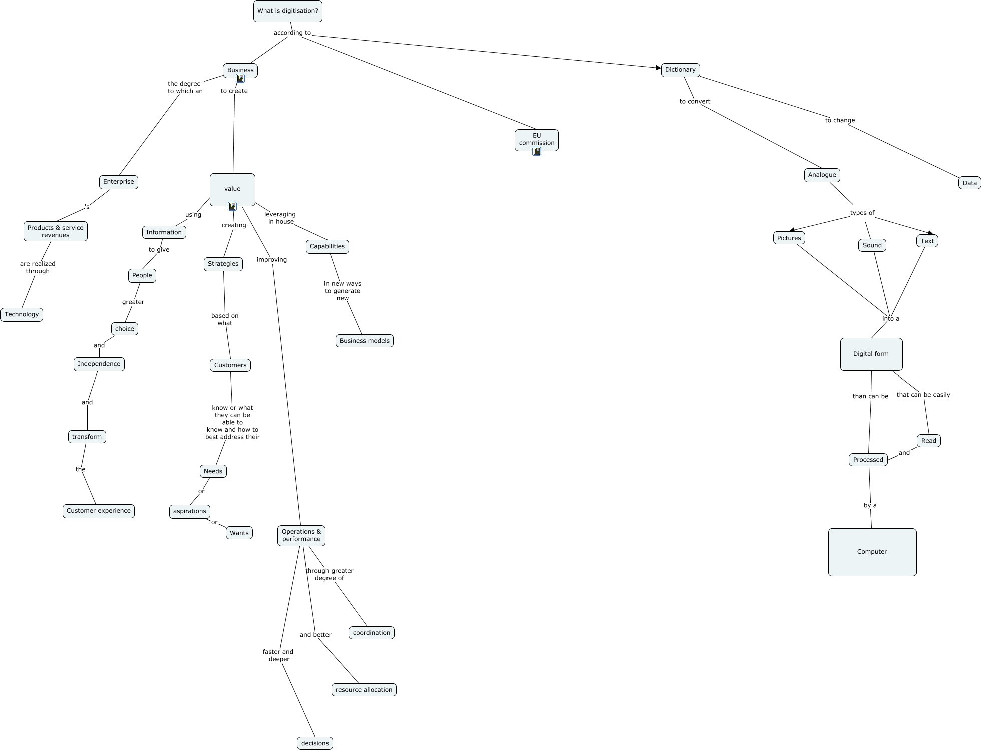 This Concept Map, created with IHMC CmapTools, has information related to: definitions-digitisation, Processed by a Computer, aspirations or Wants, Pictures into a Digital form, Products & service revenues are realized through Technology, Analogue types of Pictures, Digital form than can be Processed, Digital form that can be easily Read, Operations & performance and better resource allocation, Analogue types of Sound, Strategies based on what Customers, What is digitisation? according to EU commission, Dictionary to change Data, Independence and transform, Business the degree to which an Enterprise, Customers know or what they can be able to know and how to best address their Needs, Needs or aspirations, Text into a Digital form, value creating Strategies, Business to create value, value leveraging in house Capabilities