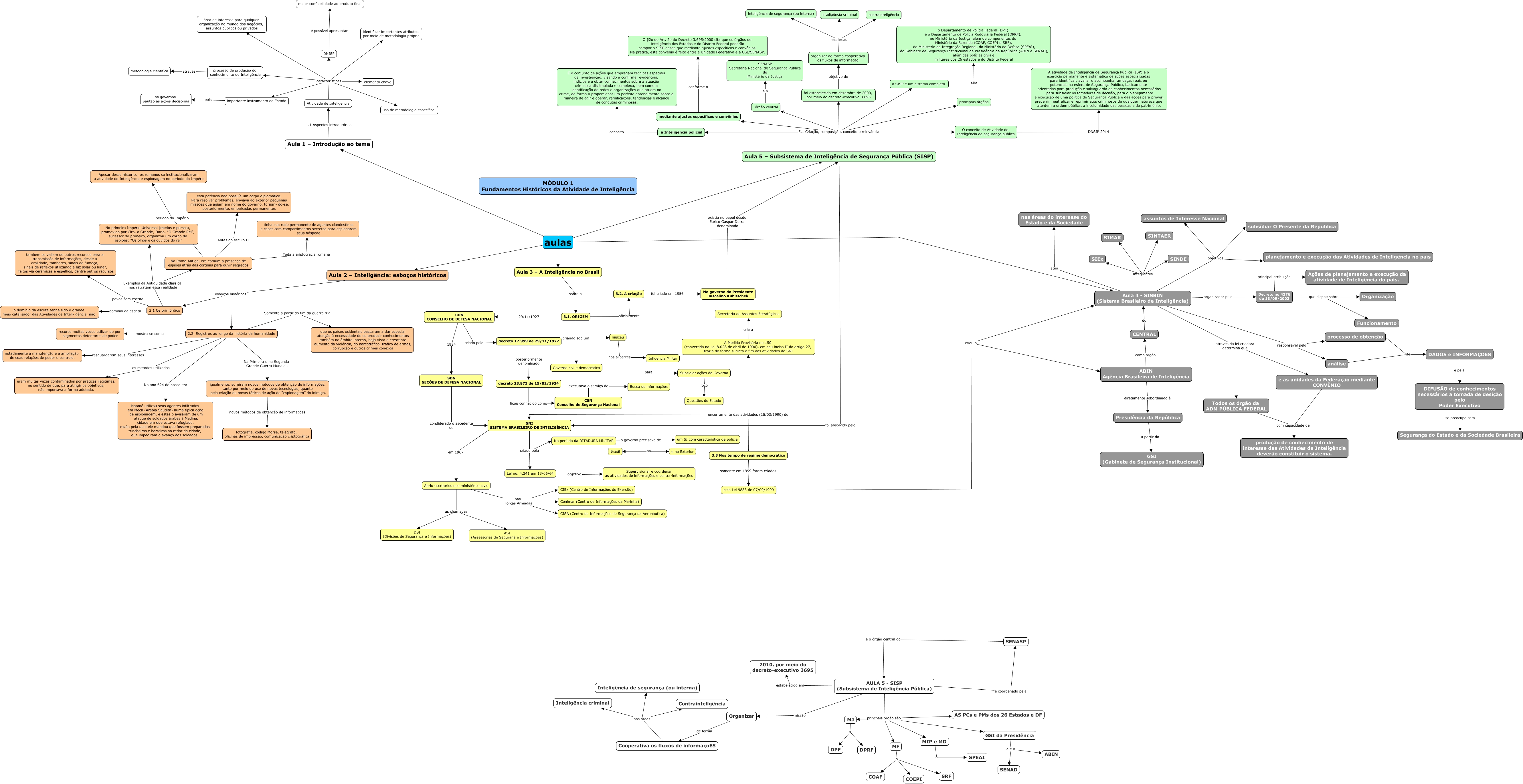Esse mapa conceitual, produzido no IHMC CmapTools, tem a informação relacionada a: 01. ciai - modulo 01 - fundamentos historicos da ai, CDN CONSELHO DE DEFESA NACIONAL criado pelo decreto 17.999 de 29/11/1927, Aula 4 - SISBIN (Sistema Brasileiro de Inteligência) através da lei criadora determina que Todos os órgão da ADM PÚBLICA FEDERAL, MÓDULO 1 Fundamentos Históricos da Atividade de Inteligência aulas Aula 3 – A Inteligência no Brasil, AULA 5 - SISP (Subsistema de Inteligência Pública) princpais órgão são MF, Atividade de Inteligência características área de interesse para qualquer organização no mundo dos negócios, assuntos públicos ou privados, Aula 4 - SISBIN (Sistema Brasileiro de Inteligência) objetivos assuntos de Interesse Nacional, SNI SISTEMA BRASILEIRO DE INTELIGÊNCIA criado pela No período da DITADURA MILITAR, Decreto no 4376 de 13/09/2002 que dispoe sobre Funcionamento, decreto 23.873 de 15/02/1934 ficou conhecido como CSN Conselho de Segurança Nacional, MJ o DPF, principais órgãos são o Departamento de Polícia Federal (DPF) e o Departamento de Polícia Rodoviária Federal (DPRF), no Ministério da Justiça, além de componentes do Ministério da Fazenda (COAF, COEPI e SRF), do Ministério da Integração Regional, do Ministério da Defesa (SPEAI), do Gabinete de Segurança Institucional da Presidência da República (ABIN e SENAD), além das polícias civis e militares dos 26 estados e do Distrito Federal, MF o COAF, Supervisionar e coordenar as atividades de informações e contra-informações no e no Exterior, DADOS e INFORMAÇÕES e pela DIFUSÃO de conhecimentos necessários a tomada de desição pelo Poder Executivo, ABIN Agência Brasileira de Inteligência diretamente sobordinado à Presidência da República, Supervisionar e coordenar as atividades de informações e contra-informações no Brasil, O conceito de Atividade de Inteligência de segurança pública DNSIP 2014 A atividade de Inteligência de Segurança Pública (ISP) é o exercício permanente e sistemático de ações especializadas para identificar, avaliar e acompanhar ameaças reais ou potenciais na esfera de Segurança Pública, basicamente orientadas para produção e salvaguarda de conhecimentos necessários para subsidiar os tomadores de decisão, para o planejamento e execução de uma política de Segurança Pública e das ações para prever, prevenir, neutralizar e reprimir atos criminosos de qualquer natureza que atentem à ordem pública, à incolumidade das pessoas e do patrimônio., importante instrumento do Estado pois os governos pautão as ações decisórias, Atividade de Inteligência características importante instrumento do Estado, DNISP é possível apresentar maior confiabilidade ao produto final