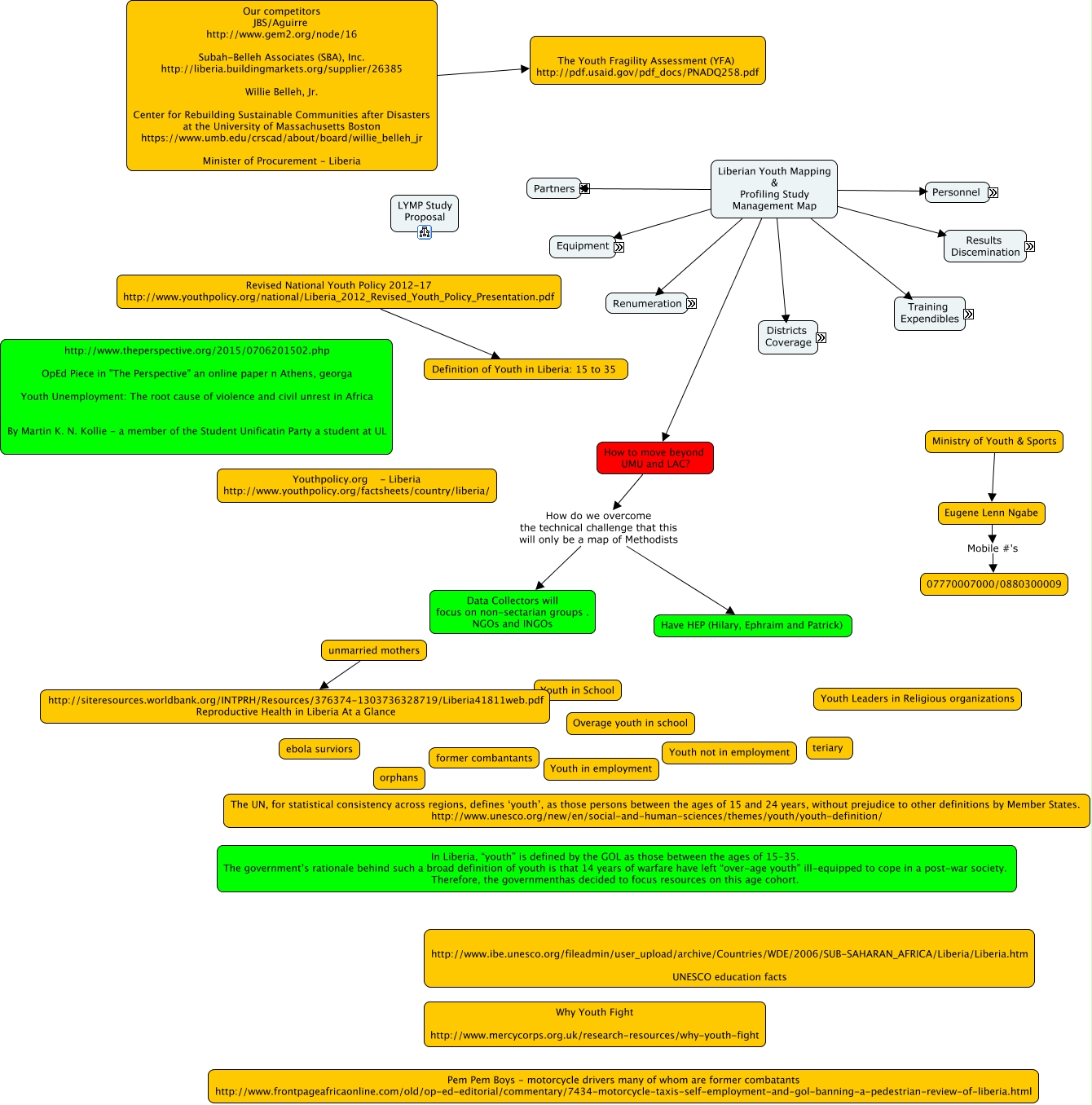 This Concept Map, created with IHMC CmapTools, has information related to: LYMP_Management, Reverand Sampson Nyanti Methodist Schools, Revised National Youth Policy 2012-17 http://www.youthpolicy.org/national/Liberia_2012_Revised_Youth_Policy_Presentation.pdf Definition of Youth in Liberia: 15 to 35, In-country Two options Data Collectors to Monrovia, Liberian Youth Mapping & Profiling Study Management Map Districts Bong, Liberian Youth Mapping & Profiling Study Management Map Data Reporting Disemination CDs/DVDs, Liberian Youth Mapping & Profiling Study Management Map Partners Principal Investigators, How to move beyond UMU and LAC? How do we overcome the technical challenge that this will only be a map of Methodists Have HEP (Hilary, Ephraim and Patrick), Eugene Lenn Ngabe Mobile #'s 07770007000/0880300009, Car Rental, Visas $800 2X400, Data Recording SmartPhones ????, Car Driver, Liberian Youth Mapping & Profiling Study Management Map Districts Grad Kru, Data Recording iPads one for each district and for Coordinators (X20/21), Our competitors JBS/Aguirre http://www.gem2.org/node/16 Subah-Belleh Associates (SBA), Inc. http://liberia.buildingmarkets.org/supplier/26385 Willie Belleh, Jr. Center for Rebuilding Sustainable Communities after Disasters at the University of Massachusetts Boston https://www.umb.edu/crscad/about/board/willie_belleh_jr Minister of Procurement - Liberia The Youth Fragility Assessment (YFA) http://pdf.usaid.gov/pdf_docs/PNADQ258.pdf, Liberian Youth Mapping & Profiling Study Management Map Data Reporting Disemination MercyCorp, Liberian Youth Mapping & Profiling Study Management Map Districts River Gee, Liberian Youth Mapping & Profiling Study Management Map Renumeration UMU Coordinator X1, Training Expendibles Accommodation ????, How to move beyond UMU and LAC? How do we overcome the technical challenge that this will only be a map of Methodists Data Collectors will focus on non-sectarian groups . NGOs and INGOs