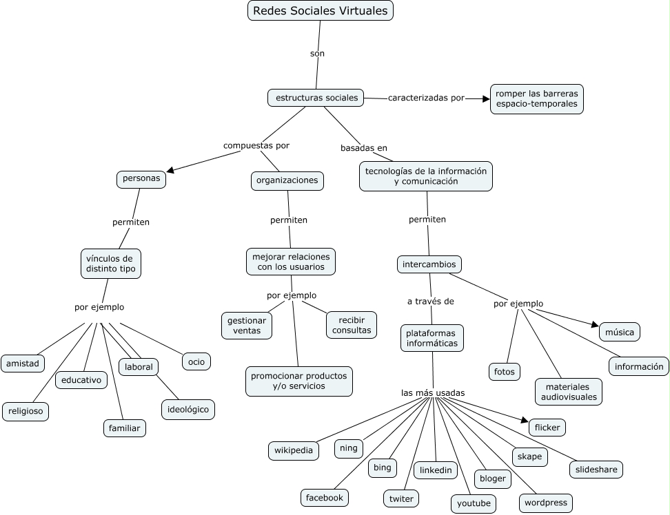 Este Cmap, tiene información relacionada con: Redes Sociales Virtuales- Alejandra Manzini, intercambios a través de plataformas informáticas, vínculos de distinto tipo por ejemplo ocio, plataformas informáticas las más usadas flicker, mejorar relaciones con los usuarios por ejemplo recibir consultas, vínculos de distinto tipo por ejemplo laboral, estructuras sociales compuestas por organizaciones, vínculos de distinto tipo por ejemplo familiar, estructuras sociales caracterizadas por romper las barreras espacio-temporales, intercambios por ejemplo información, plataformas informáticas las más usadas youtube, plataformas informáticas las más usadas twiter, vínculos de distinto tipo por ejemplo religioso, vínculos de distinto tipo por ejemplo ideológico, organizaciones permiten mejorar relaciones con los usuarios, personas permiten vínculos de distinto tipo, plataformas informáticas las más usadas wordpress, mejorar relaciones con los usuarios por ejemplo promocionar productos y/o servicios, plataformas informáticas las más usadas facebook, tecnologías de la información y comunicación permiten intercambios, vínculos de distinto tipo por ejemplo educativo