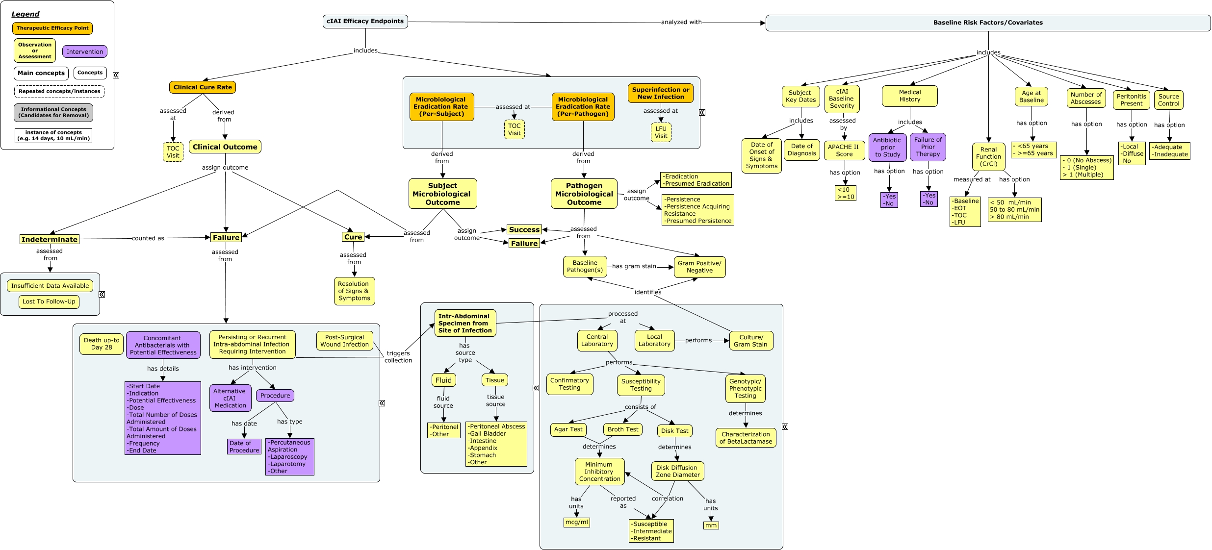 This Concept Map, created with IHMC CmapTools, has information related to: cIAI Efficacy Endpoints v7, Pathogen Microbiological Outcome assessed from Success, Minimum Inhibitory Concentration has units mcg/ml, Culture/ Gram Stain identifies Gram Positive/ Negative, Baseline Risk Factors/Covariates includes Source Control, Baseline Risk Factors/Covariates includes Medical History, cIAI Efficacy Endpoints includes Clinical Cure Rate, Disk Diffusion Zone Diameter has units mm, Susceptibility Testing consists of Agar Test, Genotypic/ Phenotypic Testing determines Characterization of BetaLactamase, Central Laboratory performs Susceptibility Testing, Clinical Cure Rate assessed at TOC Visit, Baseline Risk Factors/Covariates includes Renal Function (CrCl), Baseline Risk Factors/Covariates includes Subject Key Dates, Baseline Risk Factors/Covariates includes cIAI Baseline Severity, Post-Surgical Wound Infection triggers collection Intr-Abdominal Specimen from Site of Infection, Failure assessed from ????, Disk Diffusion Zone Diameter correlation -Susceptible -Intermediate -Resistant, Agar Test determines Minimum Inhibitory Concentration, cIAI Efficacy Endpoints includes ????, Culture/ Gram Stain identifies Baseline Pathogen(s)