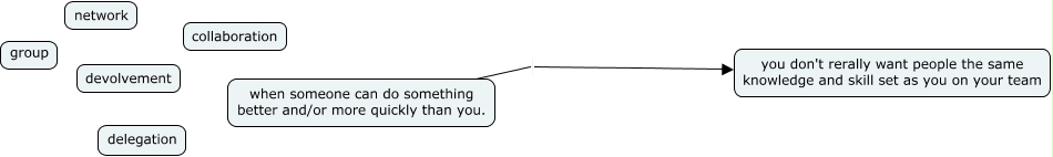 This Concept Map, created with IHMC CmapTools, has information related to: group and team - time and task management, when someone can do something better and/or more quickly than you. you don't rerally want people the same knowledge and skill set as you on your team