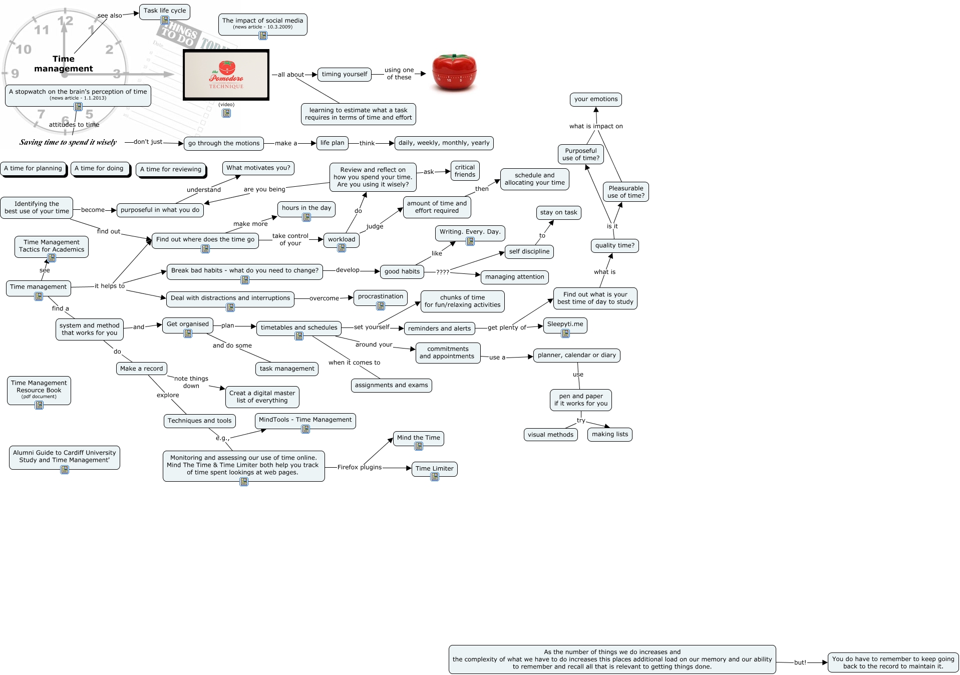 This Concept Map, created with IHMC CmapTools, has information related to: Time management, pen and paper if it works for you try making lists, Saving time to spend it wisely don't just go through the motions, (video) all about timing yourself, purposeful in what you do understand What motivates you?, Review and reflect on how you spend your time. Are you using it wisely? ask critical friends, As the number of things we do increases and the complexity of what we have to do increases this places additional load on our memory and our ability to remember and recall all that is relevant to getting things done. but! You do have to remember to keep going back to the record to maintain it., good habits ???? managing attention, Make a record explore Techniques and tools, Techniques and tools e.g., Monitoring and assessing our use of time online. Mind The Time & Time Limiter both help you track of time spent lookings at web pages., Make a record note things down Creat a digital master list of everything, Break bad habits - what do you need to change? develop good habits, Get organised and do some task management, quality time? is it Pleasurable use of time?, go through the motions make a life plan, A stopwatch on the brain's perception of time (news article - 1.1.2013) attitudes to time Saving time to spend it wisely, Time management see Time Management Tactics for Academics, Review and reflect on how you spend your time. Are you using it wisely? are you being purposeful in what you do, timing yourself using one of these, reminders and alerts get plenty of Sleepyti.me, workload do Review and reflect on how you spend your time. Are you using it wisely?