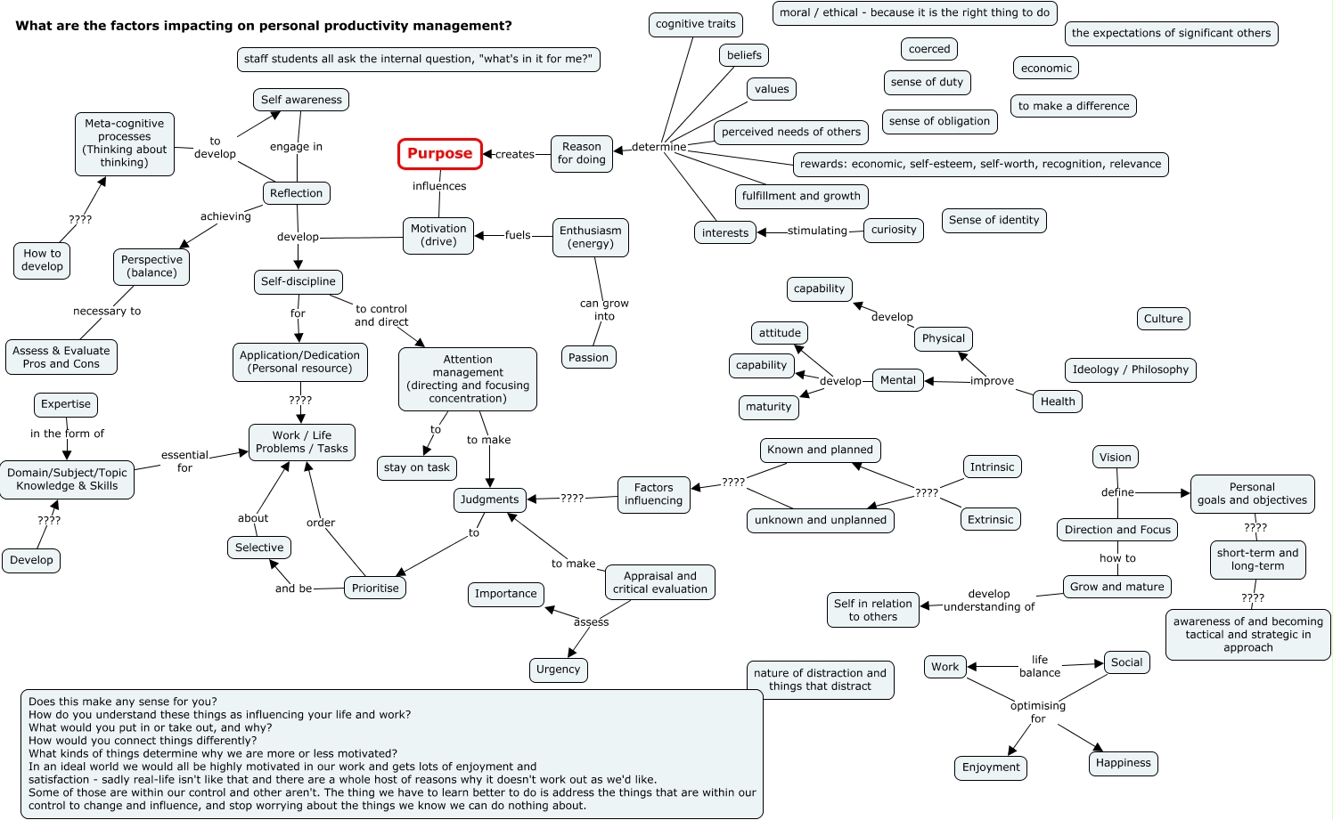This Concept Map, created with IHMC CmapTools, has information related to: whiteboard_brain_dump, Appraisal and critical evaluation assess Urgency, Vision define Direction and Focus, Reason for doing creates Purpose, Mental develop capability, Health improve Physical, Work optimising for Enjoyment, Physical develop capability, Self awareness engage in Reflection, Prioritise and be Selective, Self-discipline to control and direct Attention management (directing and focusing concentration), Intrinsic ???? unknown and unplanned, values determine Reason for doing, Motivation (drive) develop Self-discipline, Domain/Subject/Topic Knowledge & Skills essential for Work / Life Problems / Tasks, Attention management (directing and focusing concentration) to make Judgments, Factors influencing ???? Judgments, curiosity stimulating interests, interests determine Reason for doing, rewards: economic, self-esteem, self-worth, recognition, relevance determine Reason for doing, Enthusiasm (energy) fuels Motivation (drive)
