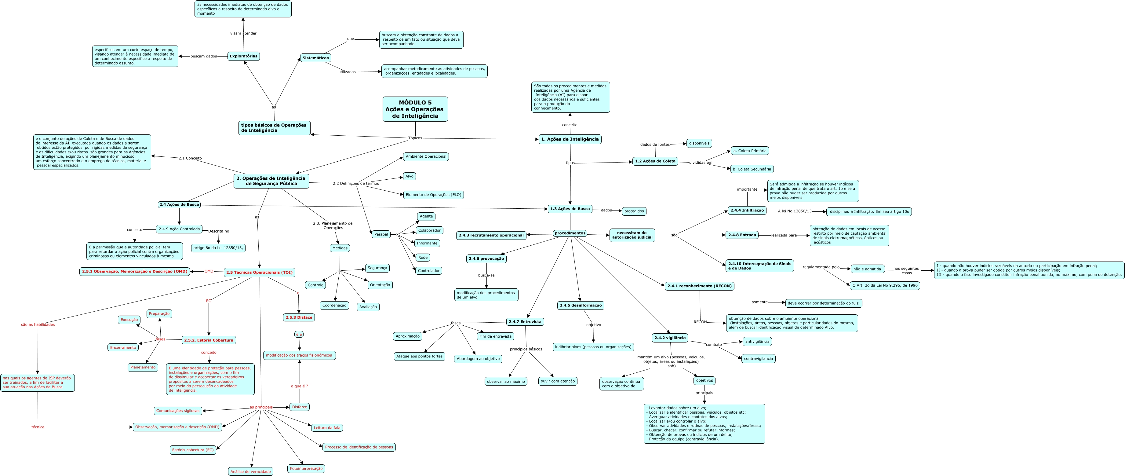 Esse mapa conceitual, produzido no IHMC CmapTools, tem a informação relacionada a: 05. ciai - modulo 05 - acoes e operacoes de inteligencia, 2.4.2 vigilância combate antivigilância, 2.4.6 provocação busca-se modificação dos procedimentos de um alvo, 2.5 Técnicas Operacionais (TOI) são as habilidades nas quais os agentes de ISP deverão ser treinados, a fim de facilitar a sua atuação nas Ações de Busca, Pessoal x Rede, 2.4.9 Ação Controlada Descrita no artigo 8o da Lei 12850/13,, 1.3 Ações de Busca dados protegidos, 1. Ações de Inteligência conceito São todos os procedimentos e medidas realizadas por uma Agência de Inteligência (AI) para dispor dos dados necessários e suficientes para a produção do conhecimento,, 2.5 Técnicas Operacionais (TOI) o 2.5.3 Disface, 2.5.2. Estória Cobertura fases Planejamento, 2.4.8 Entrada realizada para obtenção de dados em locais de acesso restrito por meio de captação ambiental de sinais eletromagnéticos, ópticos ou acústicos, 2.5 Técnicas Operacionais (TOI) as principais Disfarce, Exploratórias visam atender às necessidades imediatas de obtenção de dados específicos a respeito de determinado alvo e momento, 2.4.5 desinformação objetivo ludibriar alvos (pessoas ou organizações), 2.5.2. Estória Cobertura conceito É uma identidade de proteção para pessoas, instalações e organizações, com o fim de dissimular e acobertar os verdadeiros propósitos a serem desencadeados por meio da persecução da atividade de inteligência., 2.5 Técnicas Operacionais (TOI) as principais Processo de identificação de pessoas, 2. Operações de Inteligência de Segurança Pública 2.1 Conceito é o conjunto de ações de Coleta e de Busca de dados de interesse da AI, executada quando os dados a serem obtidos estão protegidos por rígidas medidas de segurança e as dificuldades e/ou riscos são grandes para as Agências de Inteligência, exigindo um planejamento minucioso, um esforço concentrado e o emprego de técnica, material e pessoal especializados., 2.5.2. Estória Cobertura fases Encerramento, Medidas de Controle, Medidas de Avaliação, Exploratórias buscam dados específicos em um curto espaço de tempo, visando atender à necessidade imediata de um conhecimento específico a respeito de determinado assunto.