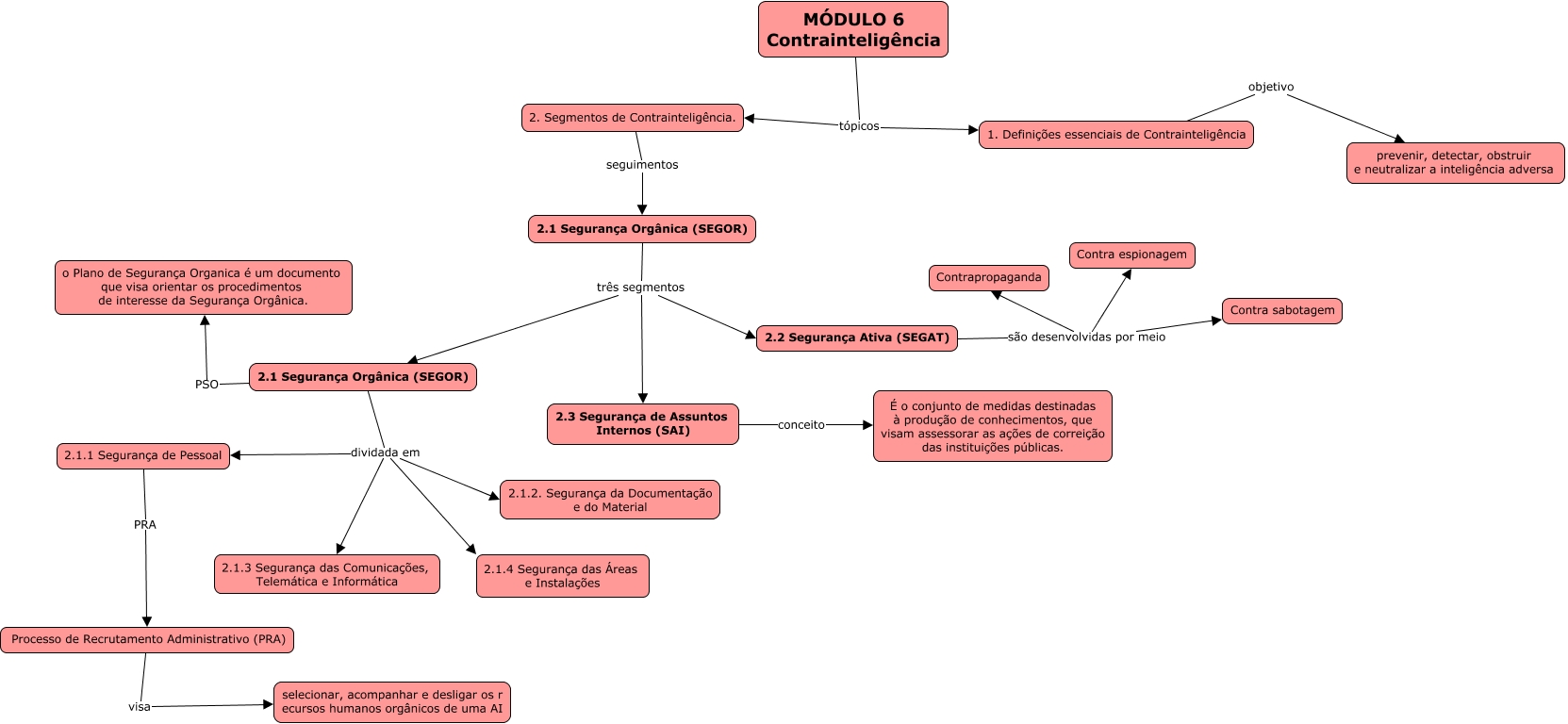 Esse mapa conceitual, produzido no IHMC CmapTools, tem a informação relacionada a: 06. ciai - modulo 06 - contrainteligencia, 2.2 Segurança Ativa (SEGAT) são desenvolvidas por meio Contra sabotagem, 2.1 Segurança Orgânica (SEGOR) três segmentos 2.1 Segurança Orgânica (SEGOR), 2.1 Segurança Orgânica (SEGOR) dividada em 2.1.1 Segurança de Pessoal, 1. Definições essenciais de Contrainteligência objetivo prevenir, detectar, obstruir e neutralizar a inteligência adversa, 2.3 Segurança de Assuntos Internos (SAI) conceito É o conjunto de medidas destinadas à produção de conhecimentos, que visam assessorar as ações de correição das instituições públicas., 2.1 Segurança Orgânica (SEGOR) três segmentos 2.3 Segurança de Assuntos Internos (SAI), 2.1.1 Segurança de Pessoal PRA Processo de Recrutamento Administrativo (PRA), 2. Segmentos de Contrainteligência. seguimentos 2.1 Segurança Orgânica (SEGOR), MÓDULO 6 Contrainteligência tópicos 2. Segmentos de Contrainteligência., 2.1 Segurança Orgânica (SEGOR) dividada em 2.1.2. Segurança da Documentação e do Material, 2.2 Segurança Ativa (SEGAT) são desenvolvidas por meio Contra espionagem, Processo de Recrutamento Administrativo (PRA) visa selecionar, acompanhar e desligar os r ecursos humanos orgânicos de uma AI, 2.2 Segurança Ativa (SEGAT) são desenvolvidas por meio Contrapropaganda, MÓDULO 6 Contrainteligência tópicos 1. Definições essenciais de Contrainteligência, 2.1 Segurança Orgânica (SEGOR) dividada em 2.1.4 Segurança das Áreas e Instalações, 2.1 Segurança Orgânica (SEGOR) dividada em 2.1.3 Segurança das Comunicações, Telemática e Informática, 2.1 Segurança Orgânica (SEGOR) PSO o Plano de Segurança Organica é um documento que visa orientar os procedimentos de interesse da Segurança Orgânica., 2.1 Segurança Orgânica (SEGOR) três segmentos 2.2 Segurança Ativa (SEGAT)