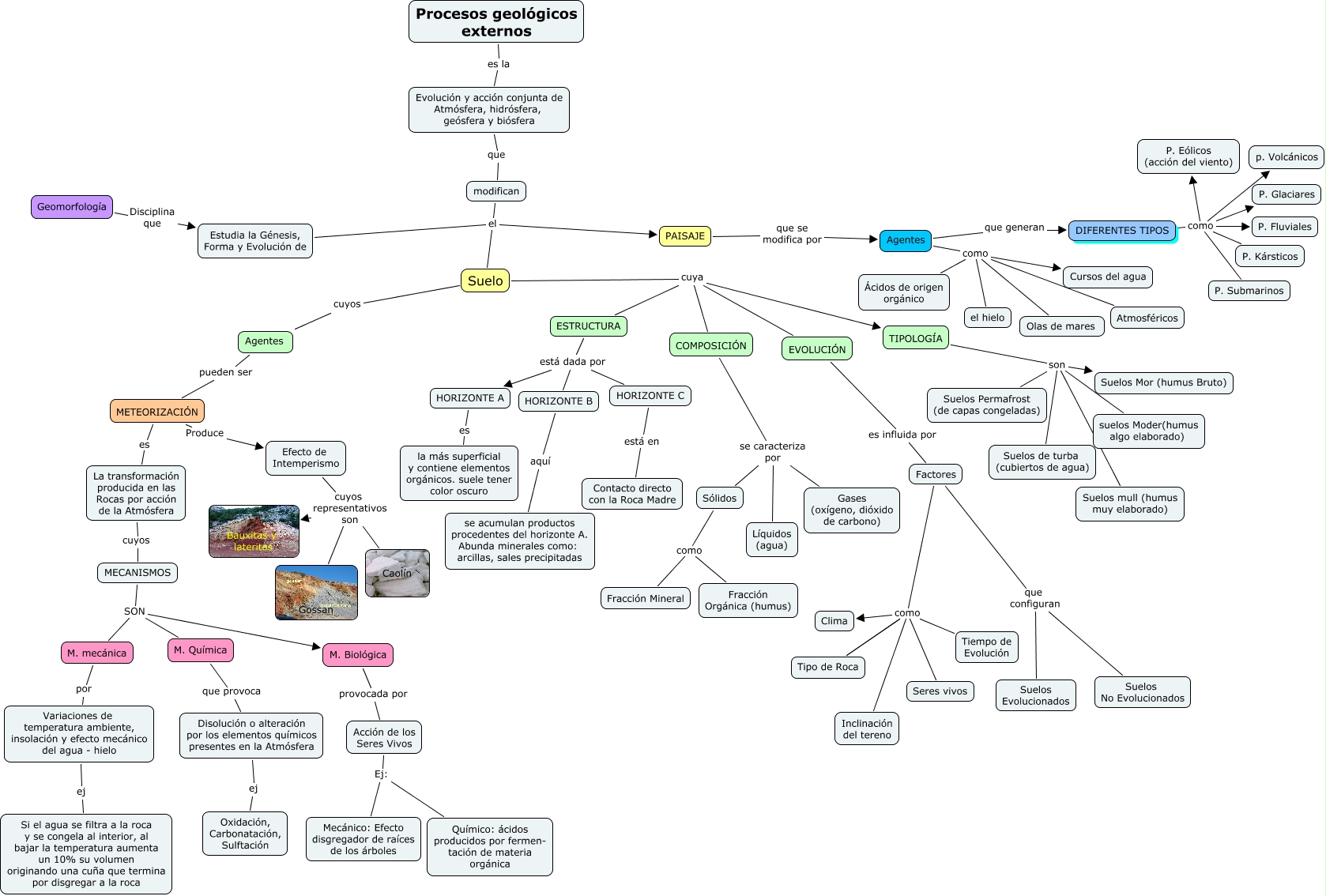 Este Cmap, tiene información relacionada con: suelo y paisaje, Disolución o alteración por los elementos químicos presentes en la Atmósfera ej Oxidación, Carbonatación, Sulftación, Agentes como el hielo, Factores como Tiempo de Evolución, HORIZONTE C está en Contacto directo con la Roca Madre, Acción de los Seres Vivos Ej: Químico: ácidos producidos por fermen- tación de materia orgánica, Procesos geológicos externos es la Evolución y acción conjunta de Atmósfera, hidrósfera, geósfera y biósfera, EVOLUCIÓN es influida por Factores, TIPOLOGÍA son Suelos mull (humus muy elaborado), Agentes como Ácidos de origen orgánico, Sólidos como Fracción Mineral, Efecto de Intemperismo cuyos representativos son Bauxitas y lateritas, HORIZONTE B aquí se acumulan productos procedentes del horizonte A. Abunda minerales como: arcillas, sales precipitadas, TIPOLOGÍA son Suelos Mor (humus Bruto), modifican el Suelo, Factores que configuran Suelos Evolucionados, Tipo de Roca como Inclinación del tereno, COMPOSICIÓN se caracteriza por Líquidos (agua), Efecto de Intemperismo cuyos representativos son Gossan, Tipo de Roca como Seres vivos, Suelo cuya COMPOSICIÓN