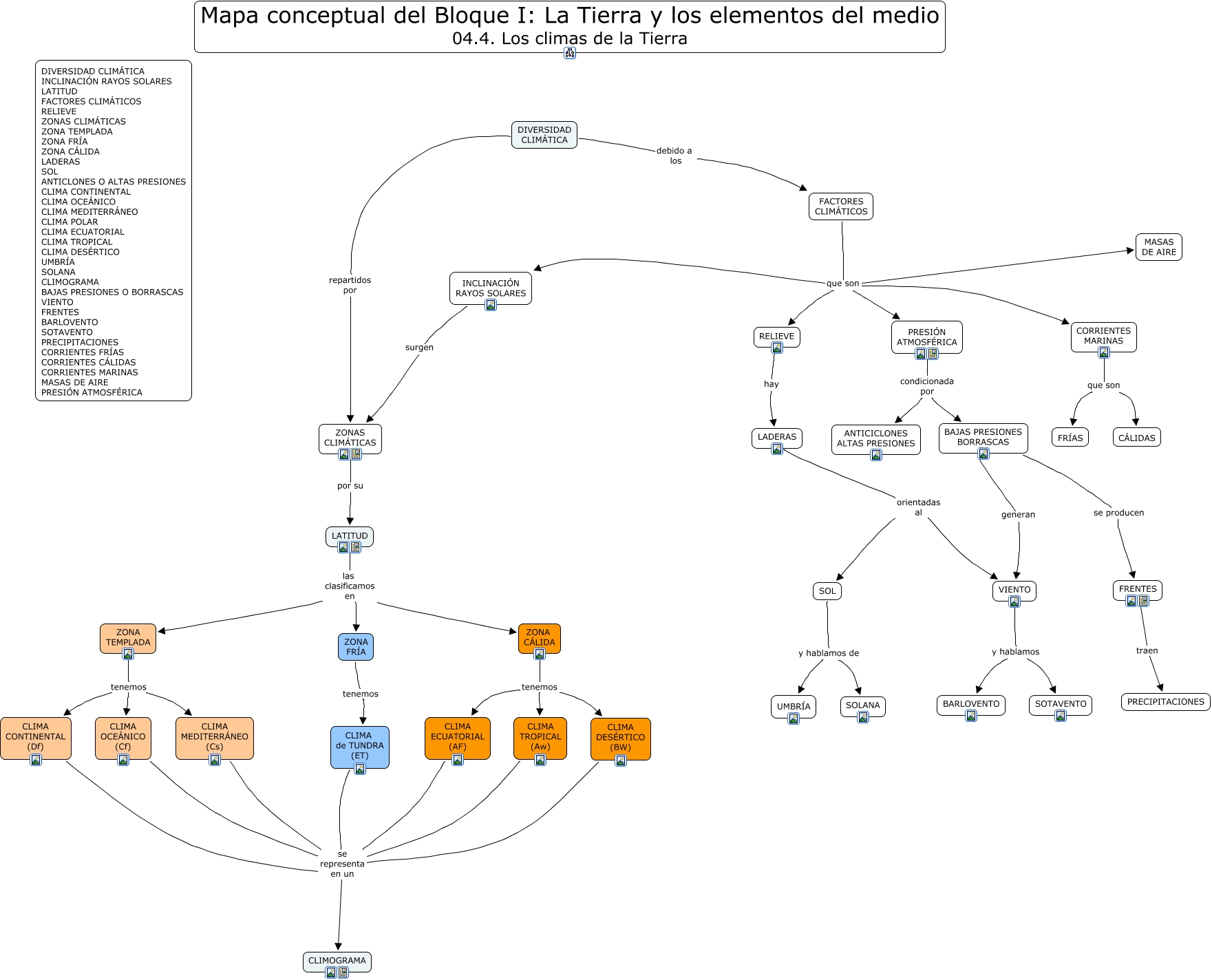 Este Cmap, tiene información relacionada con: U04.4 Los climas de la Tierra COLOR, INCLINACIÓN RAYOS SOLARES surgen ZONAS CLIMÁTICAS, CLIMA MEDITERRÁNEO (Cs) se representa en un CLIMOGRAMA, FACTORES CLIMÁTICOS que son MASAS DE AIRE, CLIMA ECUATORIAL (AF) se representa en un CLIMOGRAMA, LATITUD las clasificamos en ZONA CÁLIDA, LADERAS orientadas al SOL, FACTORES CLIMÁTICOS que son INCLINACIÓN RAYOS SOLARES, BAJAS PRESIONES BORRASCAS se producen FRENTES, LADERAS orientadas al VIENTO, ZONA TEMPLADA tenemos CLIMA OCEÁNICO (Cf), DIVERSIDAD CLIMÁTICA debido a los FACTORES CLIMÁTICOS, CLIMA CONTINENTAL (Df) se representa en un CLIMOGRAMA, FACTORES CLIMÁTICOS que son RELIEVE, CLIMA TROPICAL (Aw) se representa en un CLIMOGRAMA, ZONA CÁLIDA tenemos CLIMA ECUATORIAL (AF), ZONA TEMPLADA tenemos CLIMA CONTINENTAL (Df), FACTORES CLIMÁTICOS que son CORRIENTES MARINAS, FACTORES CLIMÁTICOS que son PRESIÓN ATMOSFÉRICA, LATITUD las clasificamos en ZONA TEMPLADA, CLIMA DESÉRTICO (BW) se representa en un CLIMOGRAMA