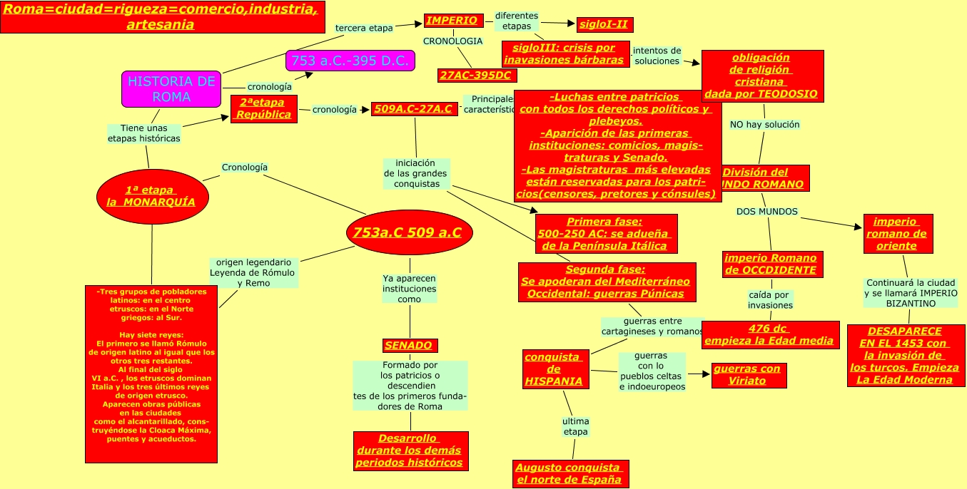 Este Cmap, tiene información relacionada con: Historia de Roma01, conquista de HISPANIA ultima etapa Augusto conquista el norte de España, 2ªetapa República cronología 509A.C-27A.C, HISTORIA DE ROMA cronología 753 a.C.-395 D.C., imperio Romano de OCCDIDENTE caída por invasiones 476 dc empieza la Edad media, imperio romano de oriente Continuará la ciudad y se llamará IMPERIO BIZANTINO DESAPARECE EN EL 1453 con la invasión de los turcos. Empieza La Edad Moderna, 1ª etapa la MONARQUÍA Cronología 753a.C 509 a.C, IMPERIO diferentes etapas sigloI-II, obligación de religión cristiana dada por TEODOSIO NO hay solución División del MUNDO ROMANO, 753a.C 509 a.C Ya aparecen instituciones como SENADO, IMPERIO diferentes etapas sigloIII: crisis por inavasiones bárbaras, 753a.C 509 a.C origen legendario Leyenda de Rómulo y Remo -Tres grupos de pobladores latinos: en el centro etruscos: en el Norte griegos: al Sur. Hay siete reyes: El primero se llamó Rómulo de origen latino al igual que los otros tres restantes. Al final del siglo VI a.C. , los etruscos dominan Italia y los tres últimos reyes de origen etrusco. Aparecen obras públicas en las ciudades como el alcantarillado, cons- truyéndose la Cloaca Máxima, puentes y acueductos., HISTORIA DE ROMA Tiene unas etapas históricas 1ª etapa la MONARQUÍA, 509A.C-27A.C iniciación de las grandes conquistas Primera fase: 500-250 AC: se adueña de la Península Itálica, 509A.C-27A.C iniciación de las grandes conquistas Segunda fase: Se apoderan del Mediterráneo Occidental: guerras Púnicas, sigloIII: crisis por inavasiones bárbaras intentos de soluciones obligación de religión cristiana dada por TEODOSIO, 1ª etapa la MONARQUÍA ???? -Tres grupos de pobladores latinos: en el centro etruscos: en el Norte griegos: al Sur. Hay siete reyes: El primero se llamó Rómulo de origen latino al igual que los otros tres restantes. Al final del siglo VI a.C. , los etruscos dominan Italia y los tres últimos reyes de origen etrusco. Aparecen obras públicas en las ciudades como el alcantarillado, cons- truyéndose la Cloaca Máxima, puentes y acueductos., conquista de HISPANIA guerras con lo pueblos celtas e indoeuropeos guerras con Viriato, 509A.C-27A.C Principales características -Luchas entre patricios con todos los derechos políticos y plebeyos. -Aparición de las primeras instituciones: comicios, magis- traturas y Senado. -Las magistraturas más elevadas están reservadas para los patri- cios(censores, pretores y cónsules), IMPERIO CRONOLOGIA 27AC-395DC, HISTORIA DE ROMA tercera etapa IMPERIO