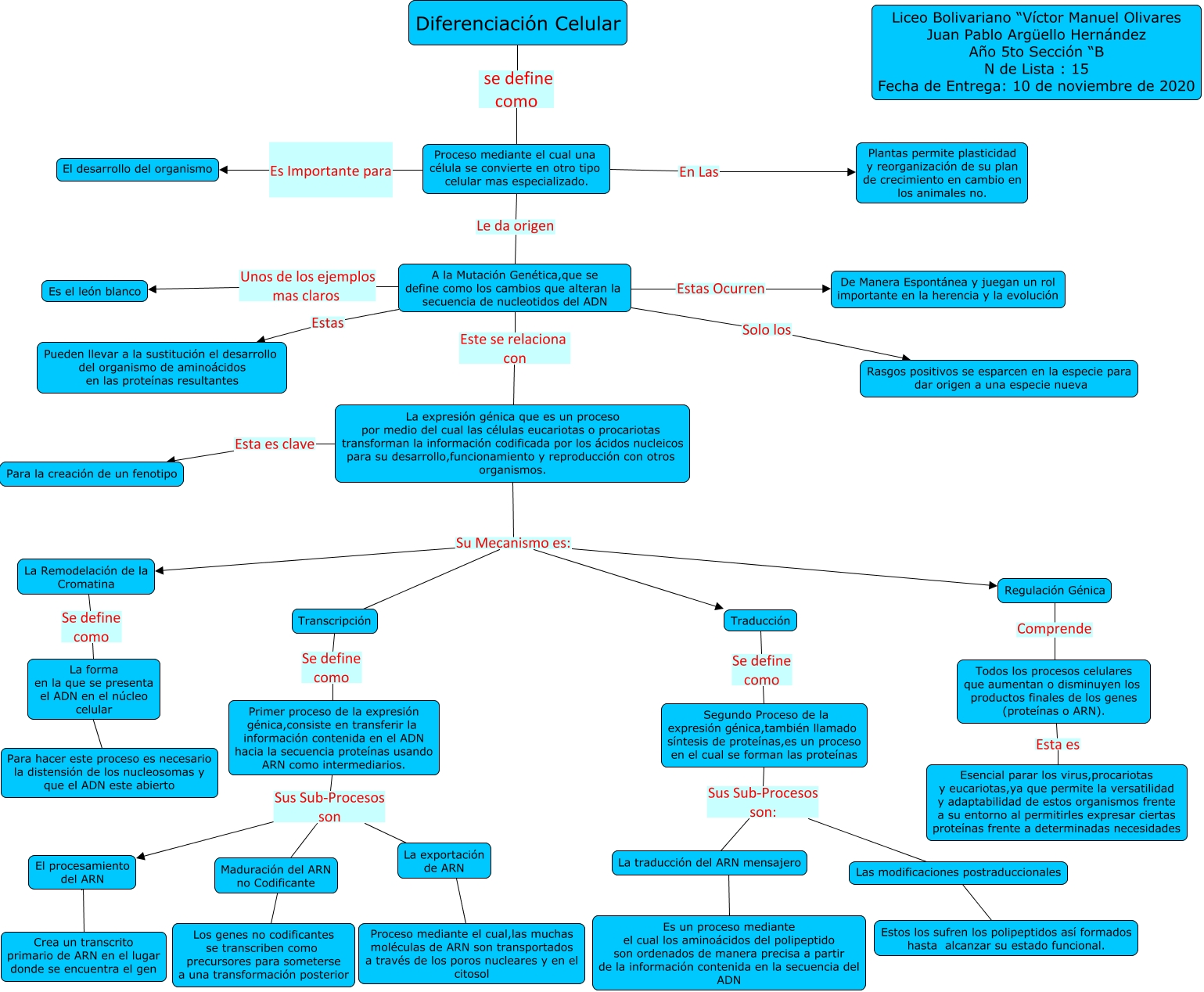 Este Cmap, tiene información relacionada con: mapa cmp tools, A la Mutación Genética,que se define como los cambios que alteran la secuencia de nucleotidos del ADN Solo los Rasgos positivos se esparcen en la especie para dar origen a una especie nueva, La expresión génica que es un proceso por medio del cual las células eucariotas o procariotas transforman la información codificada por los ácidos nucleicos para su desarrollo,funcionamiento y reproducción con otros organismos. Su Mecanismo es: La Remodelación de la Cromatina, Traducción Se define como Segundo Proceso de la expresión génica,también llamado síntesis de proteínas,es un proceso en el cual se forman las proteínas, La expresión génica que es un proceso por medio del cual las células eucariotas o procariotas transforman la información codificada por los ácidos nucleicos para su desarrollo,funcionamiento y reproducción con otros organismos. Su Mecanismo es: Transcripción, Segundo Proceso de la expresión génica,también llamado síntesis de proteínas,es un proceso en el cual se forman las proteínas Sus Sub-Procesos son: La traducción del ARN mensajero, Las modificaciones postraduccionales ???? Estos los sufren los polipeptidos así formados hasta alcanzar su estado funcional., La expresión génica que es un proceso por medio del cual las células eucariotas o procariotas transforman la información codificada por los ácidos nucleicos para su desarrollo,funcionamiento y reproducción con otros organismos. Su Mecanismo es: Traducción, La Remodelación de la Cromatina Se define como La forma en la que se presenta el ADN en el núcleo celular, Maduración del ARN no Codificante ???? Los genes no codificantes se transcriben como precursores para someterse a una transformación posterior, La traducción del ARN mensajero ???? Es un proceso mediante el cual los aminoácidos del polipeptido son ordenados de manera precisa a partir de la información contenida en la secuencia del ADN, El procesamiento del ARN ???? Crea un transcrito primario de ARN en el lugar donde se encuentra el gen, Proceso mediante el cual una célula se convierte en otro tipo celular mas especializado. Le da origen A la Mutación Genética,que se define como los cambios que alteran la secuencia de nucleotidos del ADN, Proceso mediante el cual una célula se convierte en otro tipo celular mas especializado. Es Importante para El desarrollo del organismo, A la Mutación Genética,que se define como los cambios que alteran la secuencia de nucleotidos del ADN Este se relaciona con La expresión génica que es un proceso por medio del cual las células eucariotas o procariotas transforman la información codificada por los ácidos nucleicos para su desarrollo,funcionamiento y reproducción con otros organismos., La expresión génica que es un proceso por medio del cual las células eucariotas o procariotas transforman la información codificada por los ácidos nucleicos para su desarrollo,funcionamiento y reproducción con otros organismos. Esta es clave Para la creación de un fenotipo, Primer proceso de la expresión génica,consiste en transferir la información contenida en el ADN hacia la secuencia proteínas usando ARN como intermediarios. Sus Sub-Procesos son El procesamiento del ARN, A la Mutación Genética,que se define como los cambios que alteran la secuencia de nucleotidos del ADN Unos de los ejemplos mas claros Es el león blanco, A la Mutación Genética,que se define como los cambios que alteran la secuencia de nucleotidos del ADN Estas Ocurren De Manera Espontánea y juegan un rol importante en la herencia y la evolución, Todos los procesos celulares que aumentan o disminuyen los productos finales de los genes (proteínas o ARN). Esta es Esencial parar los virus,procariotas y eucariotas,ya que permite la versatilidad y adaptabilidad de estos organismos frente a su entorno al permitirles expresar ciertas proteínas frente a determinadas necesidades, Segundo Proceso de la expresión génica,también llamado síntesis de proteínas,es un proceso en el cual se forman las proteínas Sus Sub-Procesos son: Las modificaciones postraduccionales