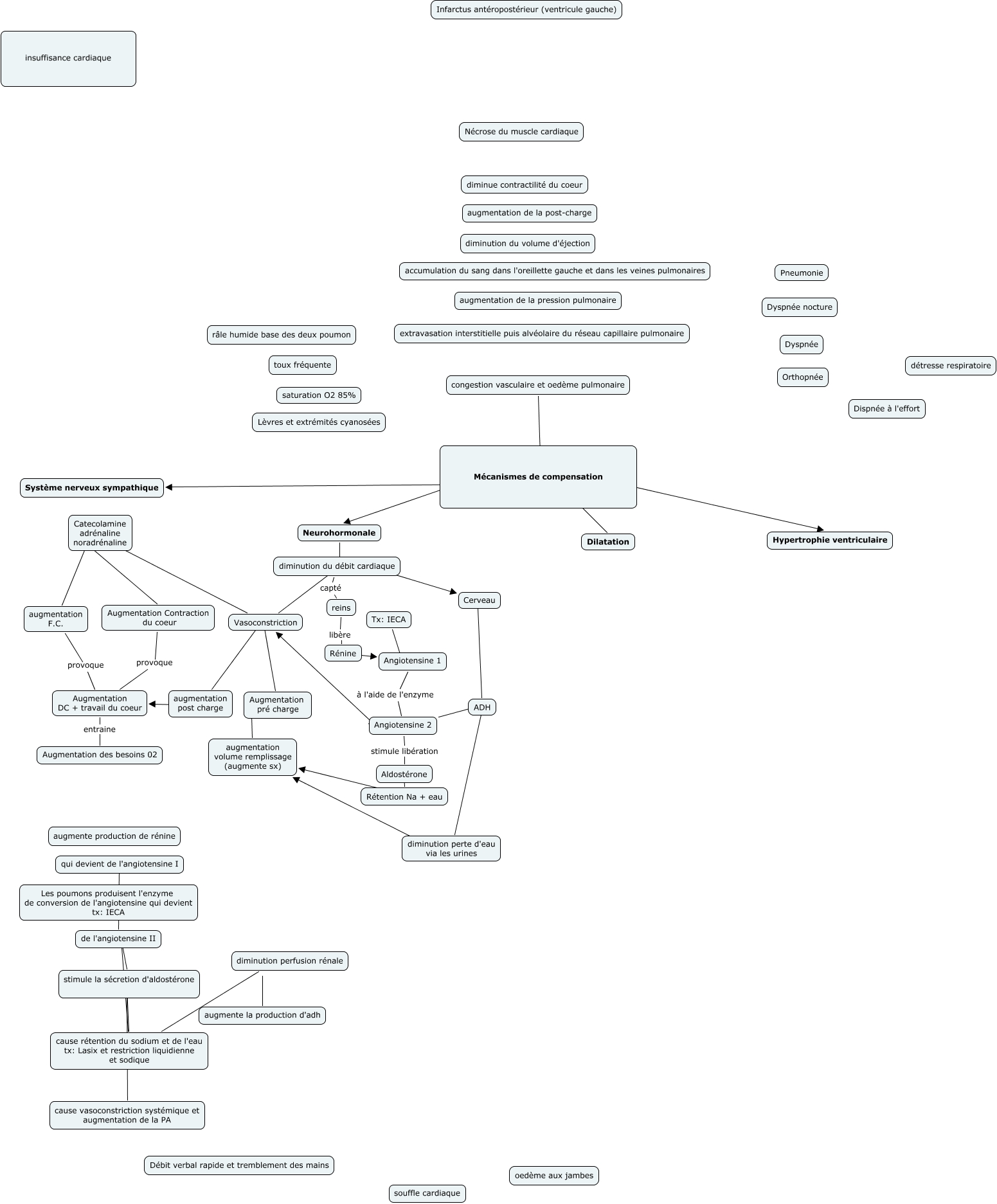 Cette carte de concepts créée avec IHMC CmapTools traite de: Sans titre 1, Cerveau ???? ADH, Neurohormonale ???? diminution du débit cardiaque, augmentation F.C. provoque Augmentation DC + travail du coeur, Catecolamine adrénaline noradrénaline ???? Vasoconstriction, Angiotensine 2 ???? Vasoconstriction, cause rétention du sodium et de l'eau tx: Lasix et restriction liquidienne et sodique ???? cause vasoconstriction systémique et augmentation de la PA, Catecolamine adrénaline noradrénaline ???? augmentation F.C., reins libère Rénine, ADH ???? diminution perte d'eau via les urines, Mécanismes de compensation Hypertrophie ventriculaire, Augmentation DC + travail du coeur entraine Augmentation des besoins 02, Vasoconstriction ???? Augmentation pré charge, Aldostérone ???? Rétention Na + eau, diminution du débit cardiaque ???? Cerveau, Augmentation pré charge ???? augmentation volume remplissage (augmente sx), Augmentation Contraction du coeur provoque Augmentation DC + travail du coeur, de l'angiotensine II ???? stimule la sécretion d'aldostérone, Catecolamine adrénaline noradrénaline ???? Augmentation Contraction du coeur, augmente la production d'adh cause rétention du sodium et de l'eau tx: Lasix et restriction liquidienne et sodique, Mécanismes de compensation ???? Neurohormonale